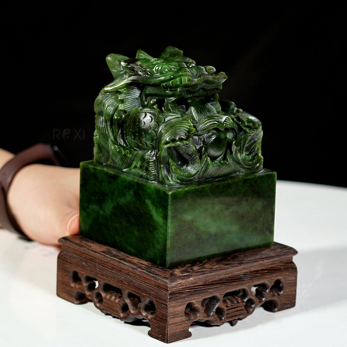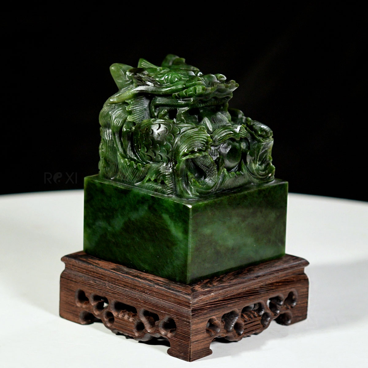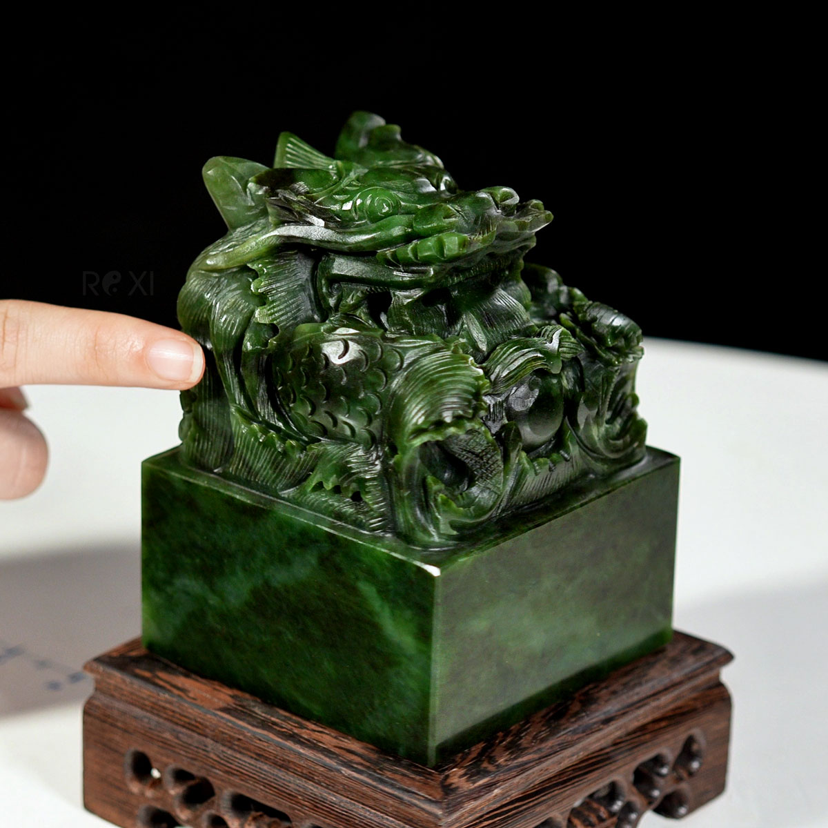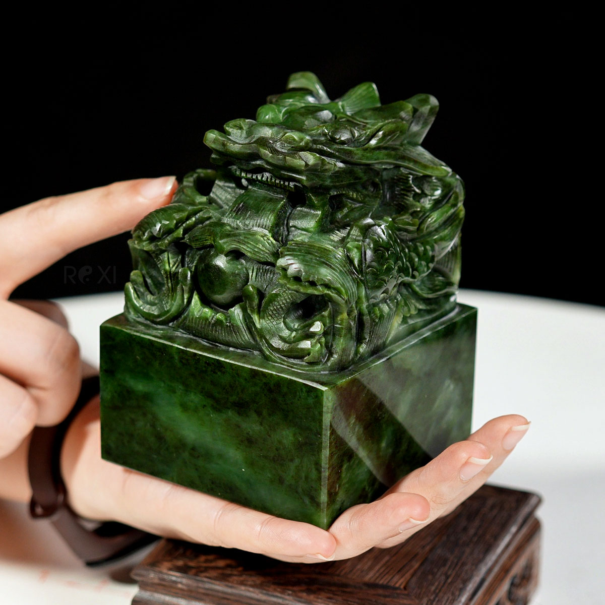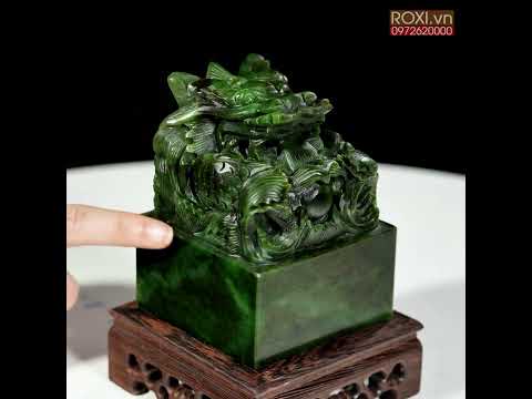 - Ấn rồng ngọc bích được chế tác từ ngọc bích nephrit quý hiếm, nổi bật với màu xanh lục đặc trưng, kết hợp với các đường nét chạm khắc sắc nét tỉ mỉ tạo nên một tác phẩm đẹp và độc đáo.