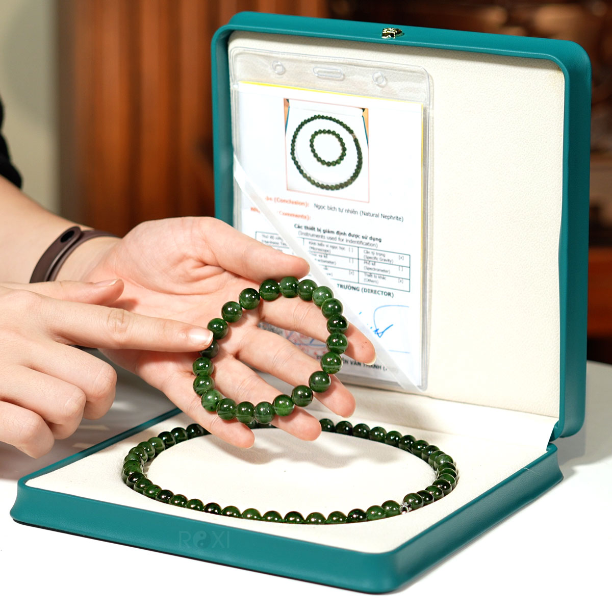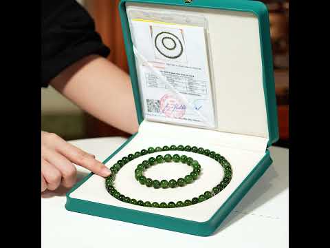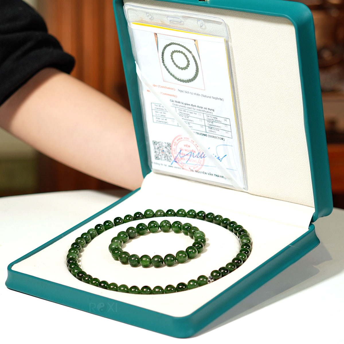 Mỗi bộ sản phẩm đều đi kèm giấy kiểm định đá quý, đảm bảo chất lượng ngọc bích tự nhiên 100%.