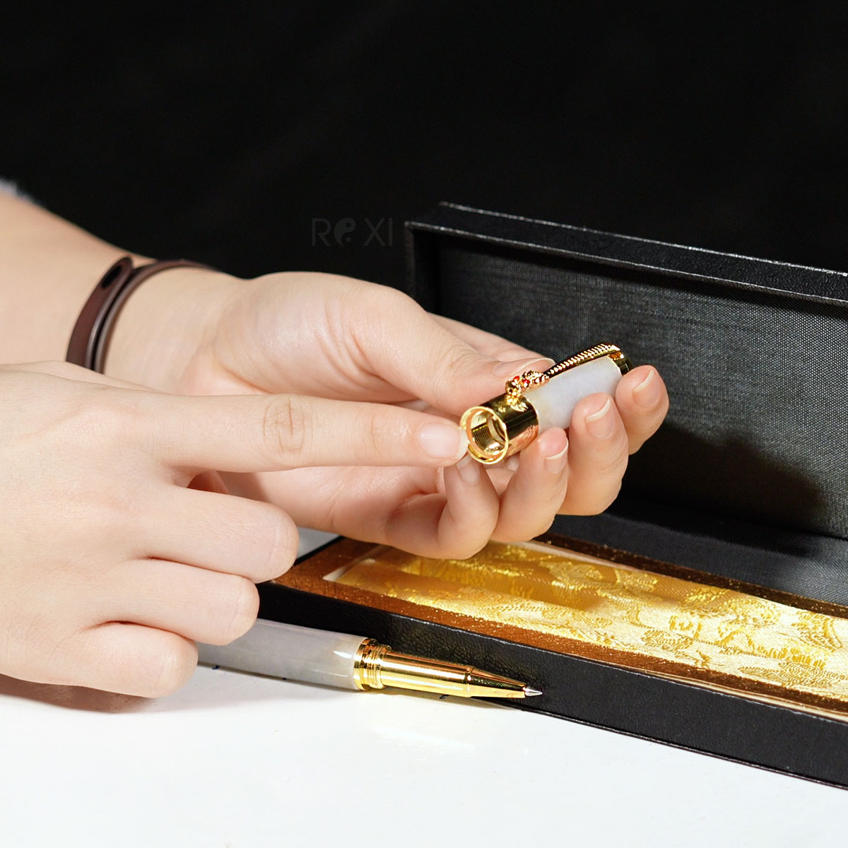Bút ký chế tác từ ngọc tự nhiên, với vân ngọc độc bản, màu sắc trang nhã, chạm khắc tinh tế và hoàn thiện tỉ mỉ. Người ta vẫn tin rằng khi sở hữu phỉ thúy sẽ có thêm may mắn, thuận lợi trong các cuộc trao đổi, đàm phán; và đặc biệt là giữ được sự bình tĩnh, quyết đoán trong những khoảnh khắc quan trọng.