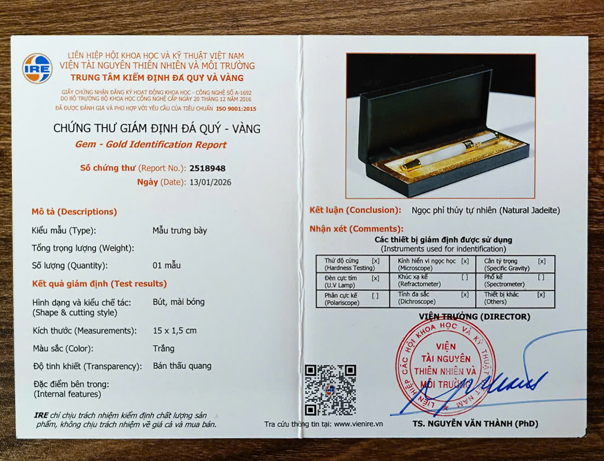 Sản phẩm gồm có: 1 vỏ bút + 1 ruột bút bi + 1 ruột bút mực + hộp đẹp + chứng thư kiểm định ngọc phỉ thúy tự nhiên.