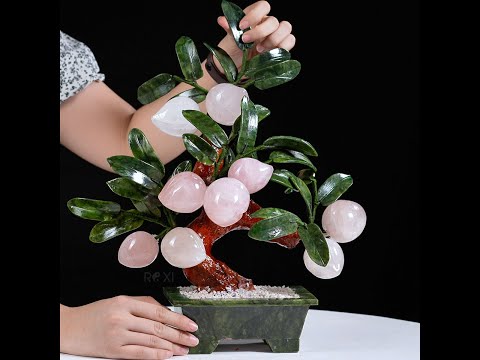 Cây đào thạch anh với những quả đào được chế tác từ thạch anh hồng tự nhiên, lá và chậu được chế tác từ ngọc serpentine. Mỗi chi tiết trên cây đều được chế tác tỉ mỉ bởi các nghệ nhân lành nghề, mang đến vẻ đẹp đầy sức sống.