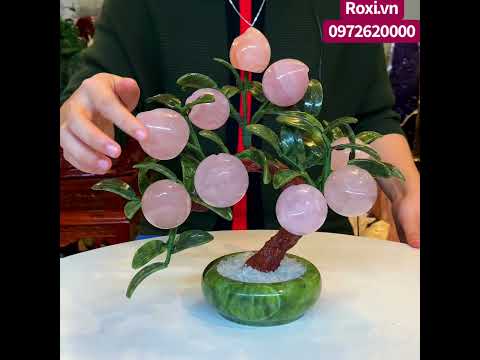 Cây đào thạch anh là vật phẩm phong thủy cát tường biểu tượng của thịnh vượng, may mắn và sức khỏe. Cây đào đá với những quả đào nhiều kích thước to nhỏ được chế tác từ thạch anh hồng tự nhiên, những chiếc lá xanh xum xuê được chế tác từ ngọc serpentine.