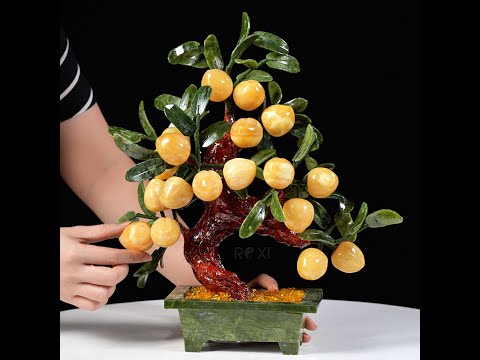 Cây đào ngọc hoàng long với những quả đào mang màu vàng rực rỡ được chế tác từ ngọc hoàng long tự nhiên, lá và chậu được chế tác từ ngọc serpentine. Mỗi chi tiết trên cây đều được chế tác tỉ mỉ bởi các nghệ nhân lành nghề, mang đến vẻ đẹp đầy sức sống.