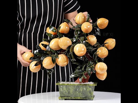 Cây đào ngọc hoàng long với những quả đào mang màu vàng rực rỡ được chế tác từ ngọc hoàng long tự nhiên, lá và chậu được chế tác từ ngọc serpentine. Mỗi chi tiết trên cây đều được chế tác tỉ mỉ bởi các nghệ nhân lành nghề, mang đến vẻ đẹp đầy sức sống.