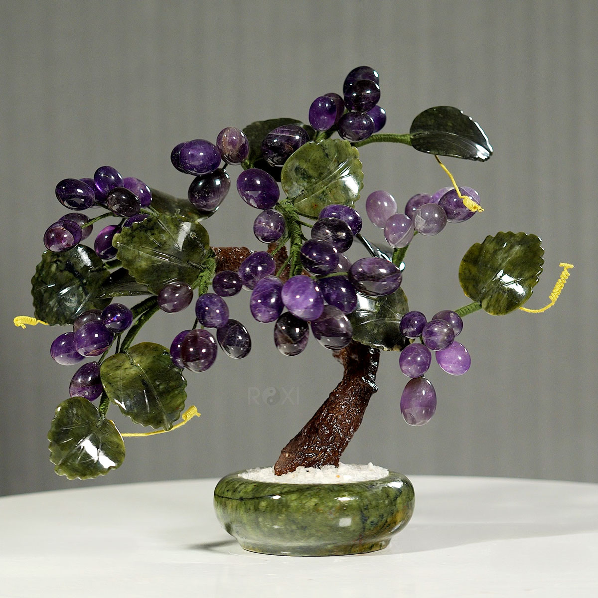 Cây nho thạch anh là sự kết hợp hài hòa giữa các loại đá quý trong tự nhiên, quả nho được chế tác từ thạch anh tự nhiên, gắn kết thành chùm, lá và chậu cây được chế tác từ ngọc serpentine mang nguồn năng lượng phong thủy mạnh mẽ.