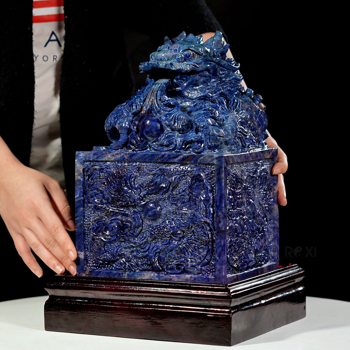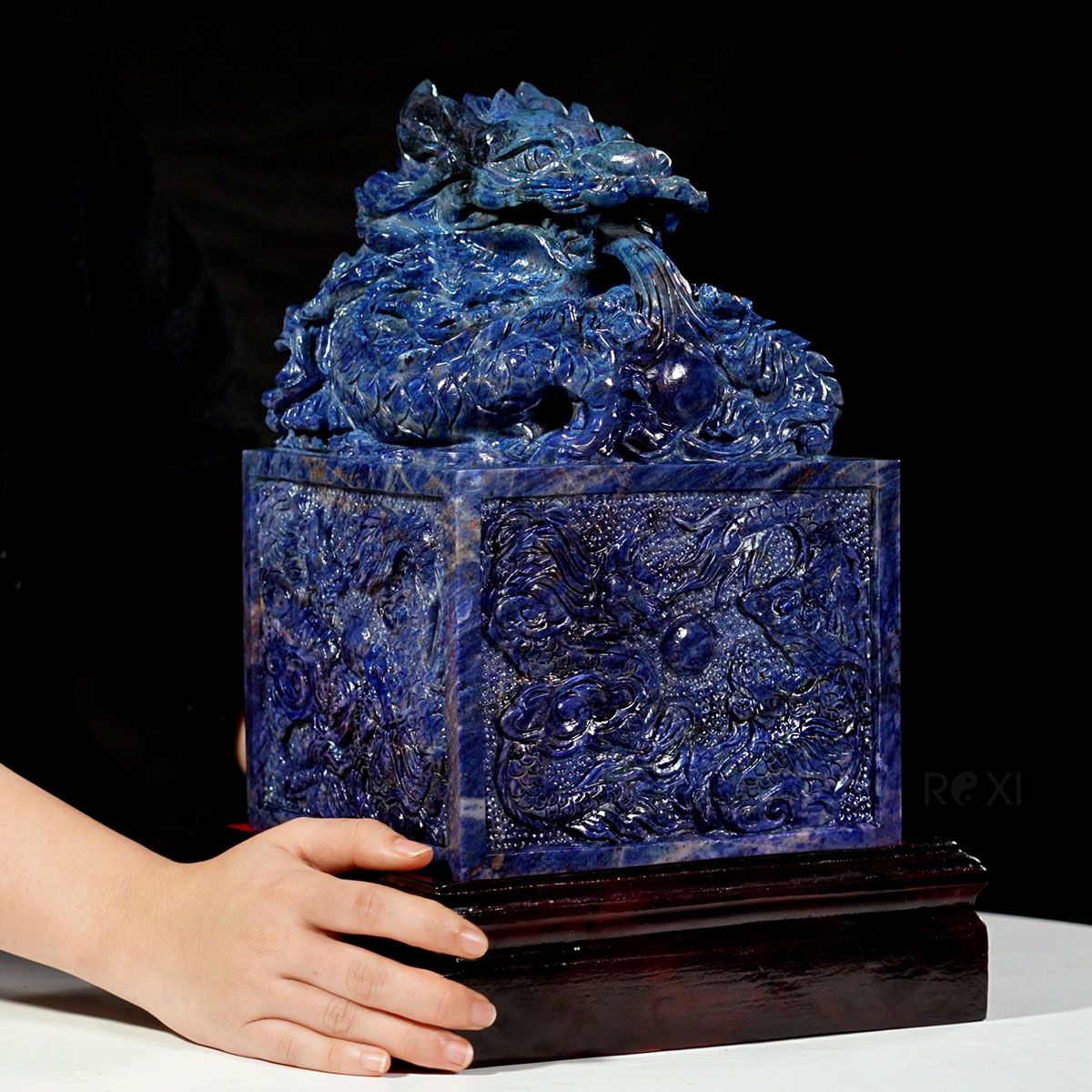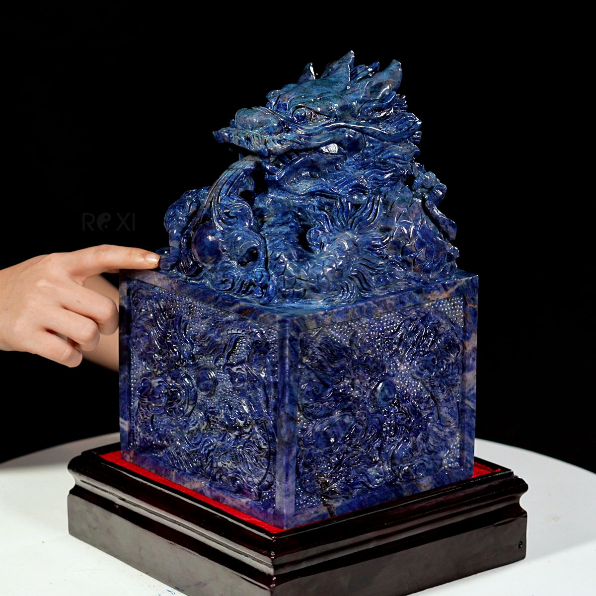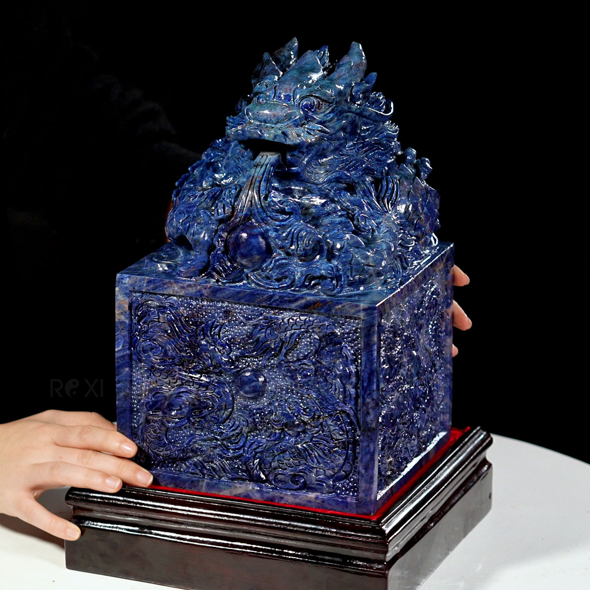 Ấn rồng Sodalite được chế tác từ khối đá tự nhiên sở hữu sắc xanh đậm xanh ngọc – xanh biển vô cùng quý hiếm, một gam màu rất khó gặp tự nhiên. Tác phẩm có giá trị sưu tầm cao và được chọn là quà tặng phong thủy cao cấp.