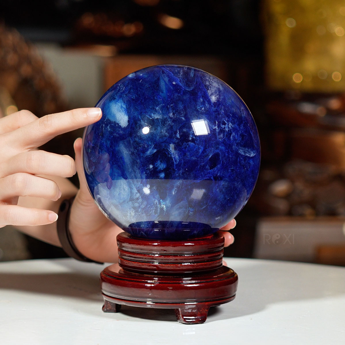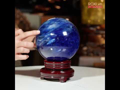 Quả cầu đá màu xanh biển mang sắc xanh sâu thẳm như đại dương. Màu xanh của đá gợi cảm giác bình yên, trí tuệ và sự thông tuệ nội tâm. Bề mặt cầu được mài nhẵn bóng, năng lượng dương mạnh mẽ lan tỏa đều ra xung quanh – biểu tượng cho sự viên mãn, trọn vẹn và hanh thông trong mọi phương diện cuộc sống.