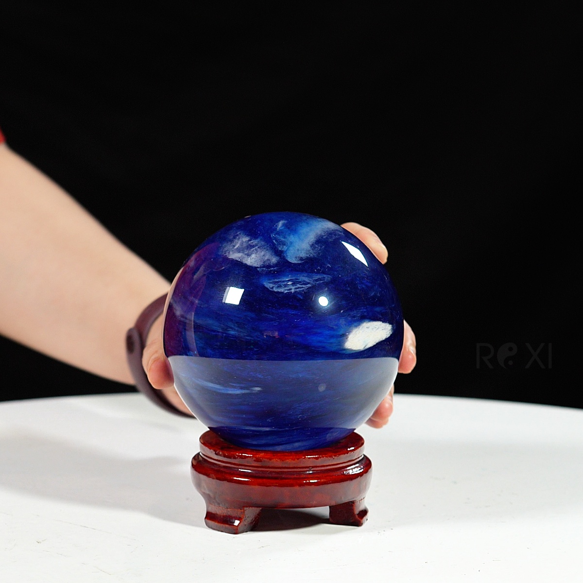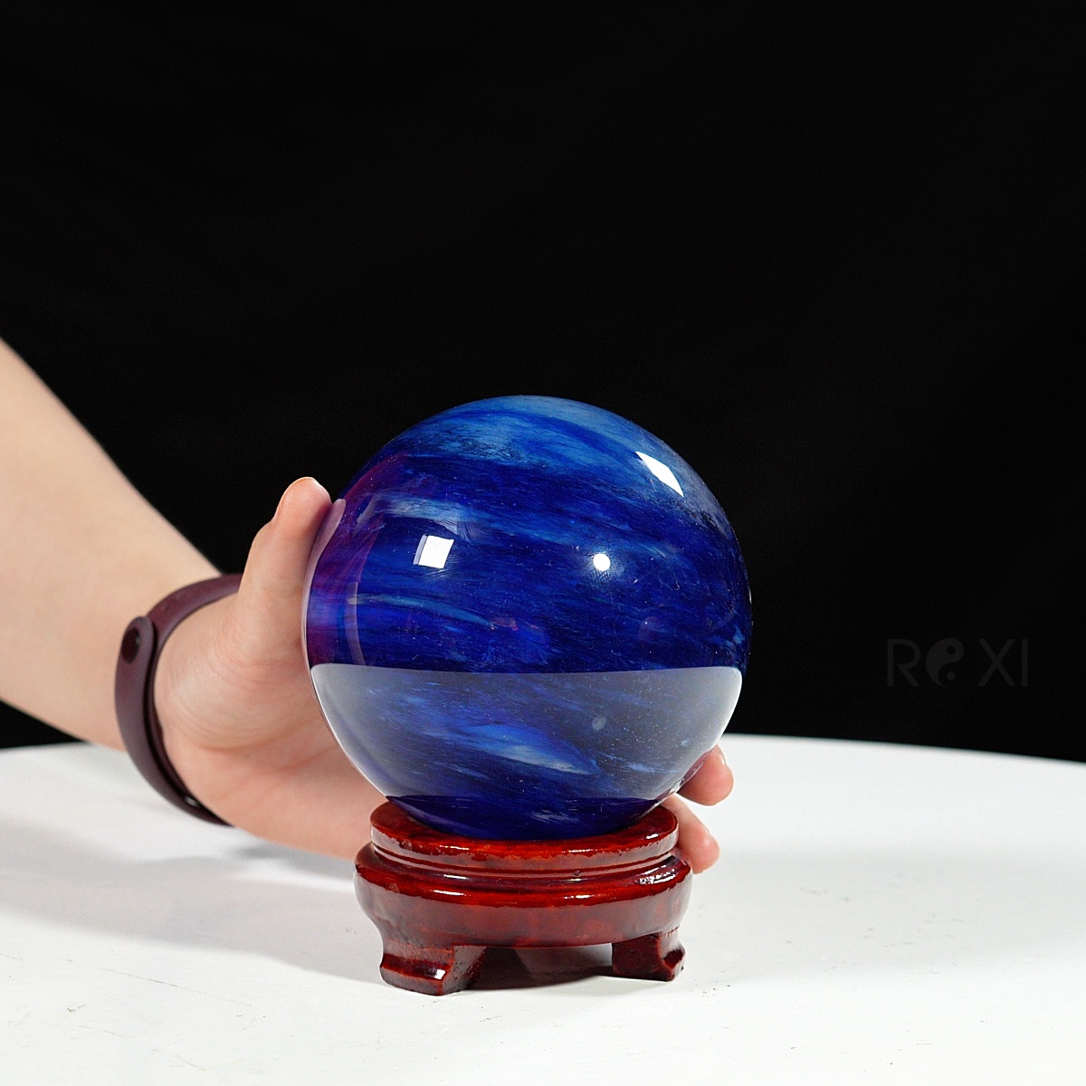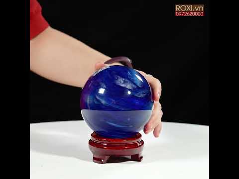 Quả cầu đá màu xanh biển mang sắc xanh sâu thẳm như đại dương. Màu xanh của đá gợi cảm giác bình yên, trí tuệ và sự thông tuệ nội tâm. Bề mặt cầu được mài nhẵn bóng, năng lượng dương mạnh mẽ lan tỏa đều ra xung quanh – biểu tượng cho sự viên mãn, trọn vẹn và hanh thông trong mọi phương diện cuộc sống.