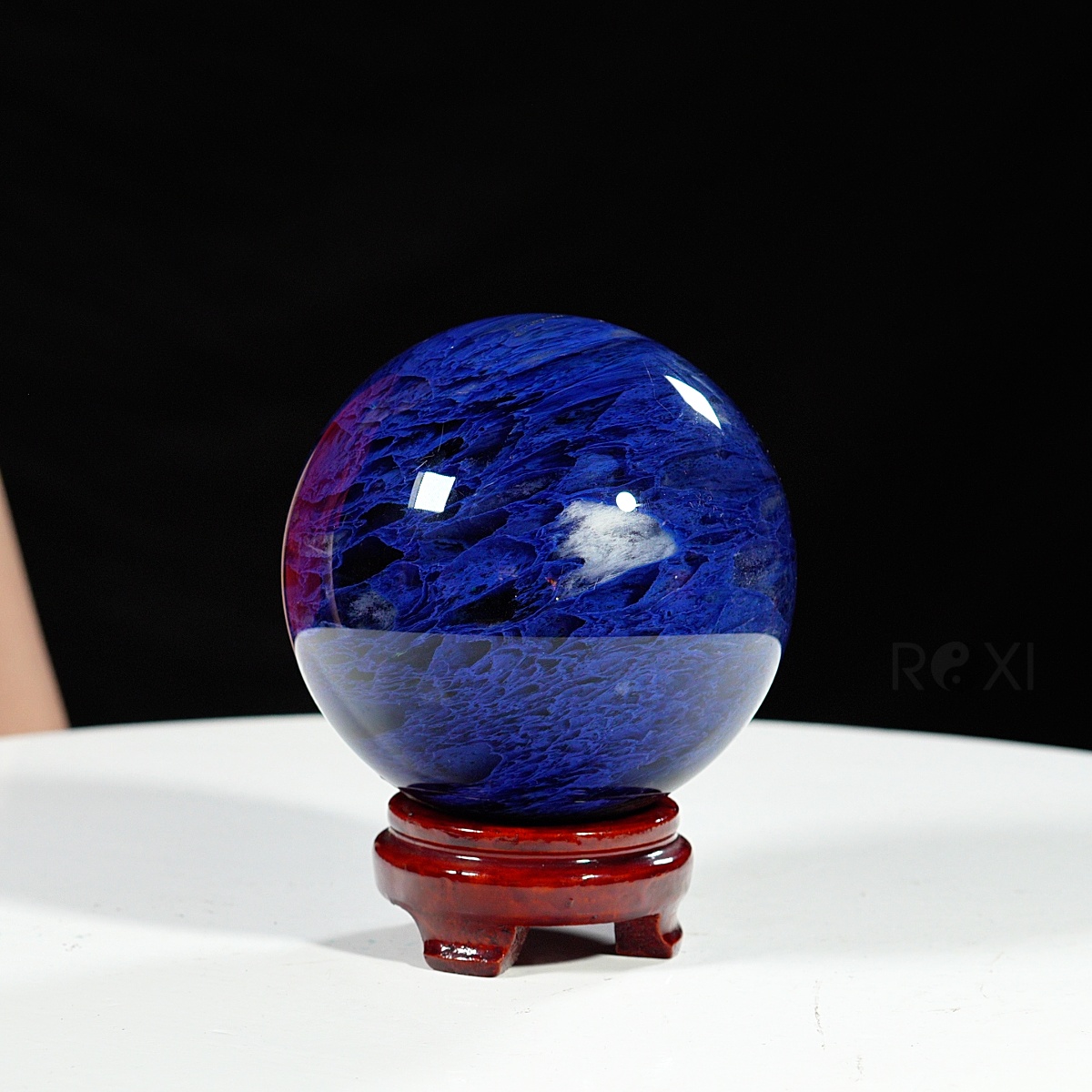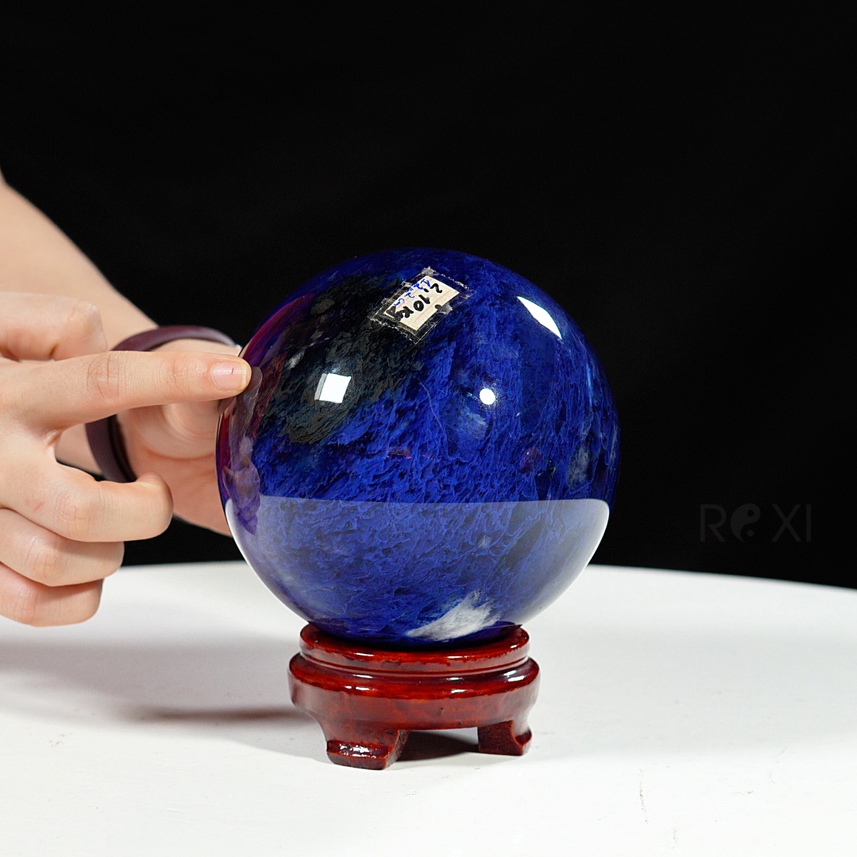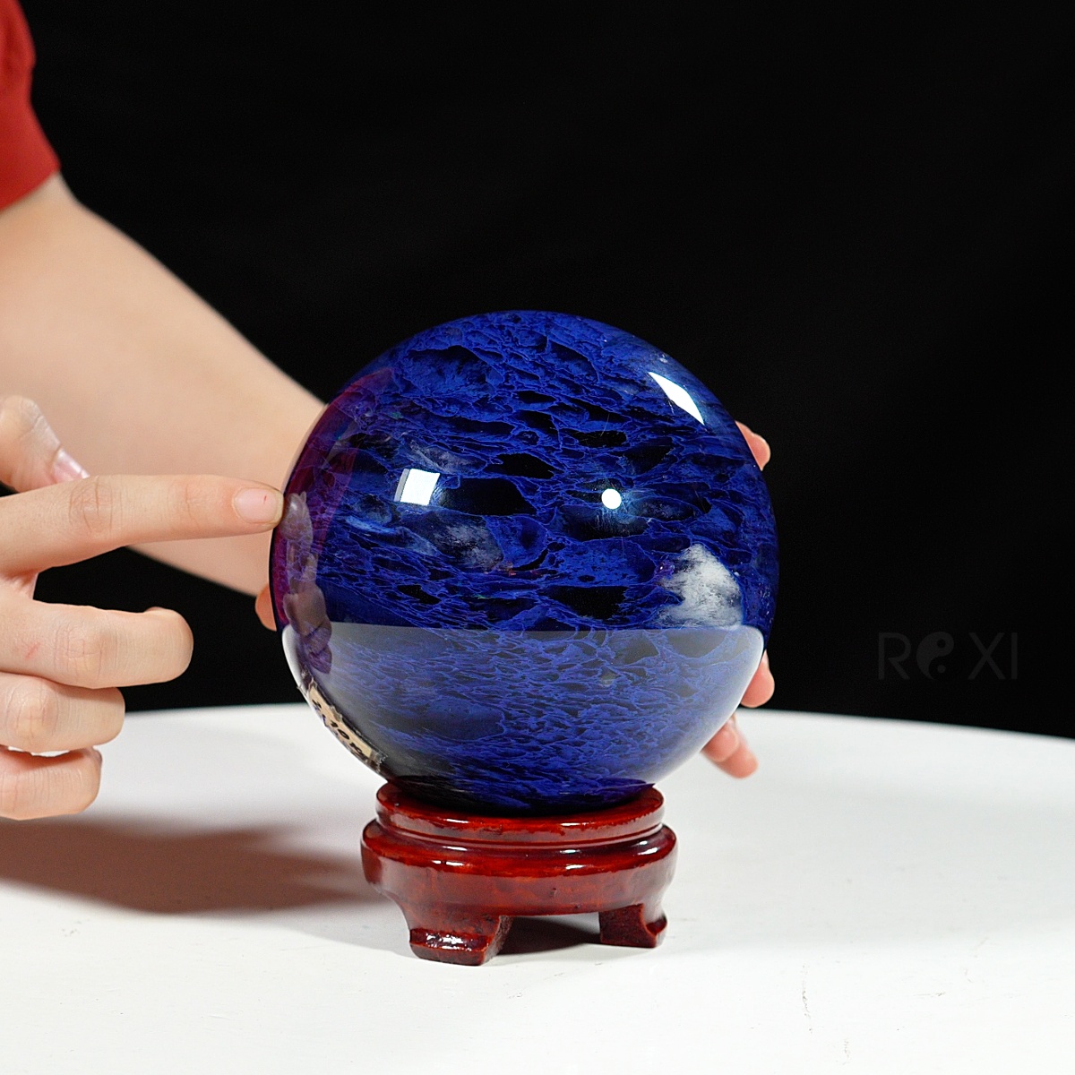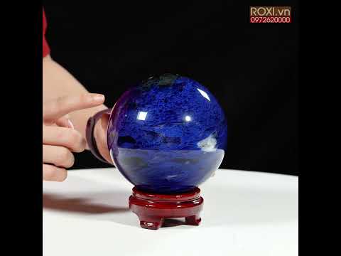 Quả cầu đá màu xanh biển mang sắc xanh sâu thẳm như đại dương. Màu xanh của đá gợi cảm giác bình yên, trí tuệ và sự thông tuệ nội tâm. Bề mặt cầu được mài nhẵn bóng, năng lượng dương mạnh mẽ lan tỏa đều ra xung quanh – biểu tượng cho sự viên mãn, trọn vẹn và hanh thông trong mọi phương diện cuộc sống.