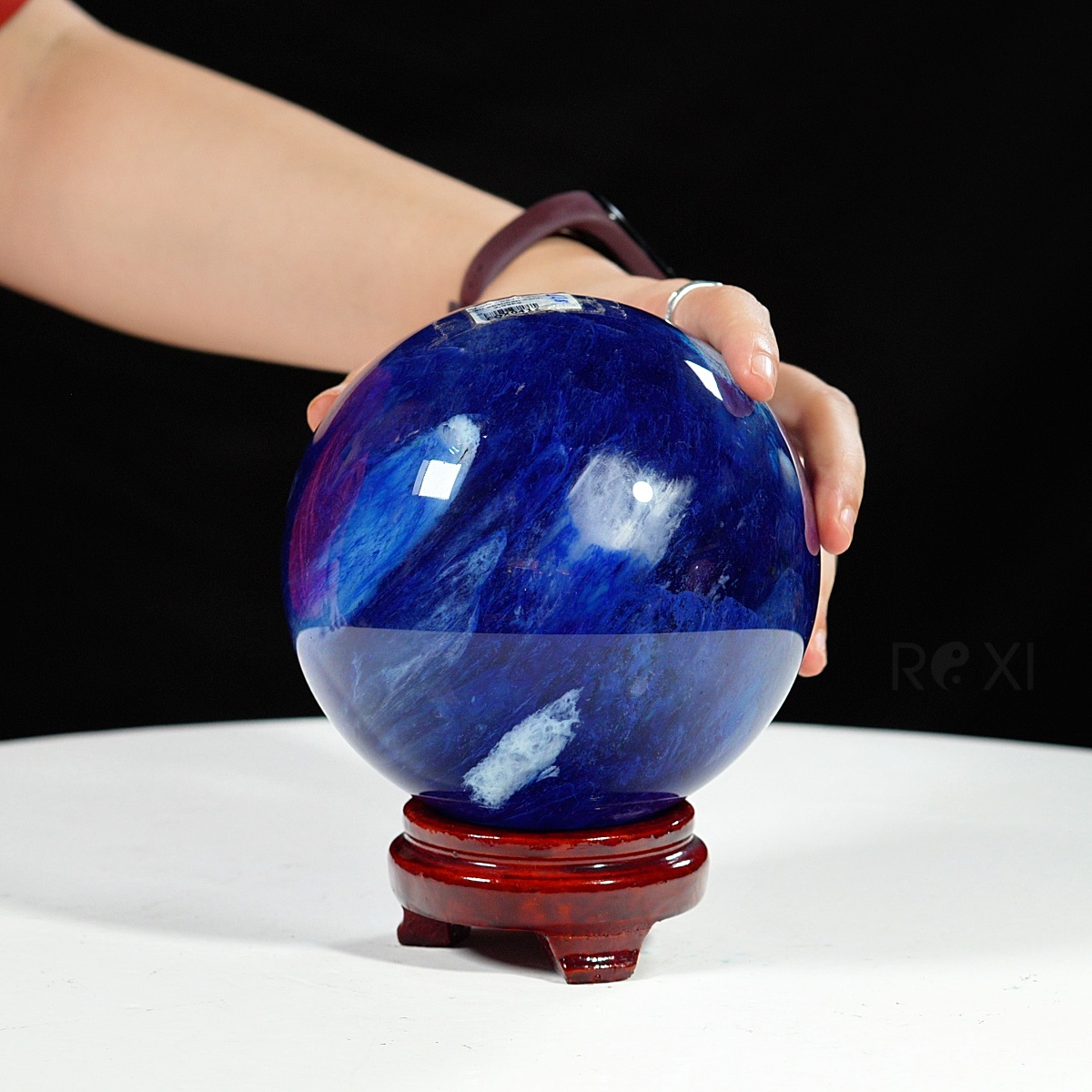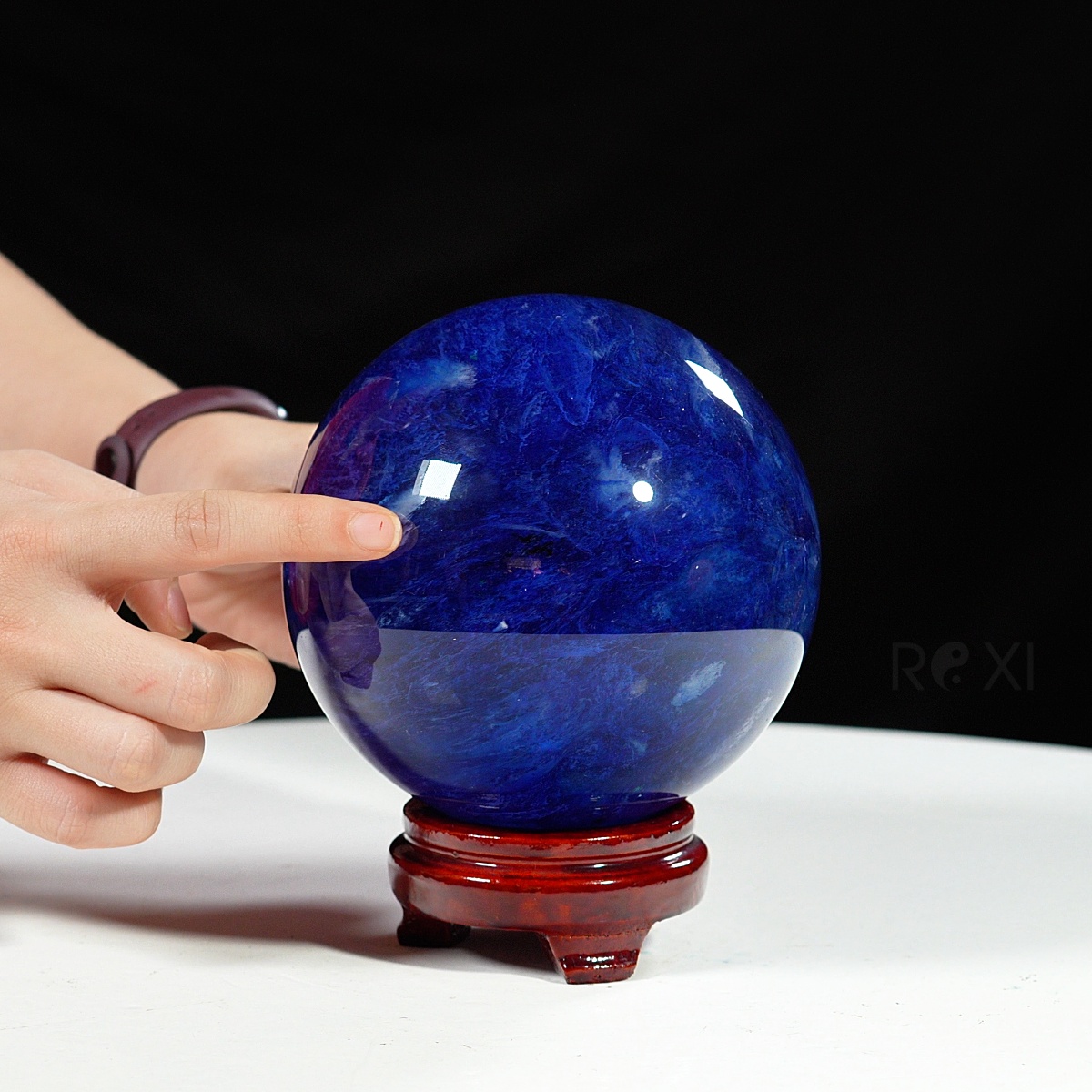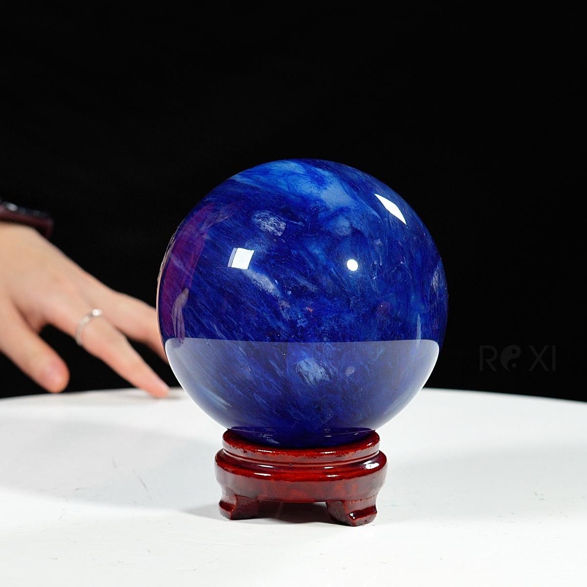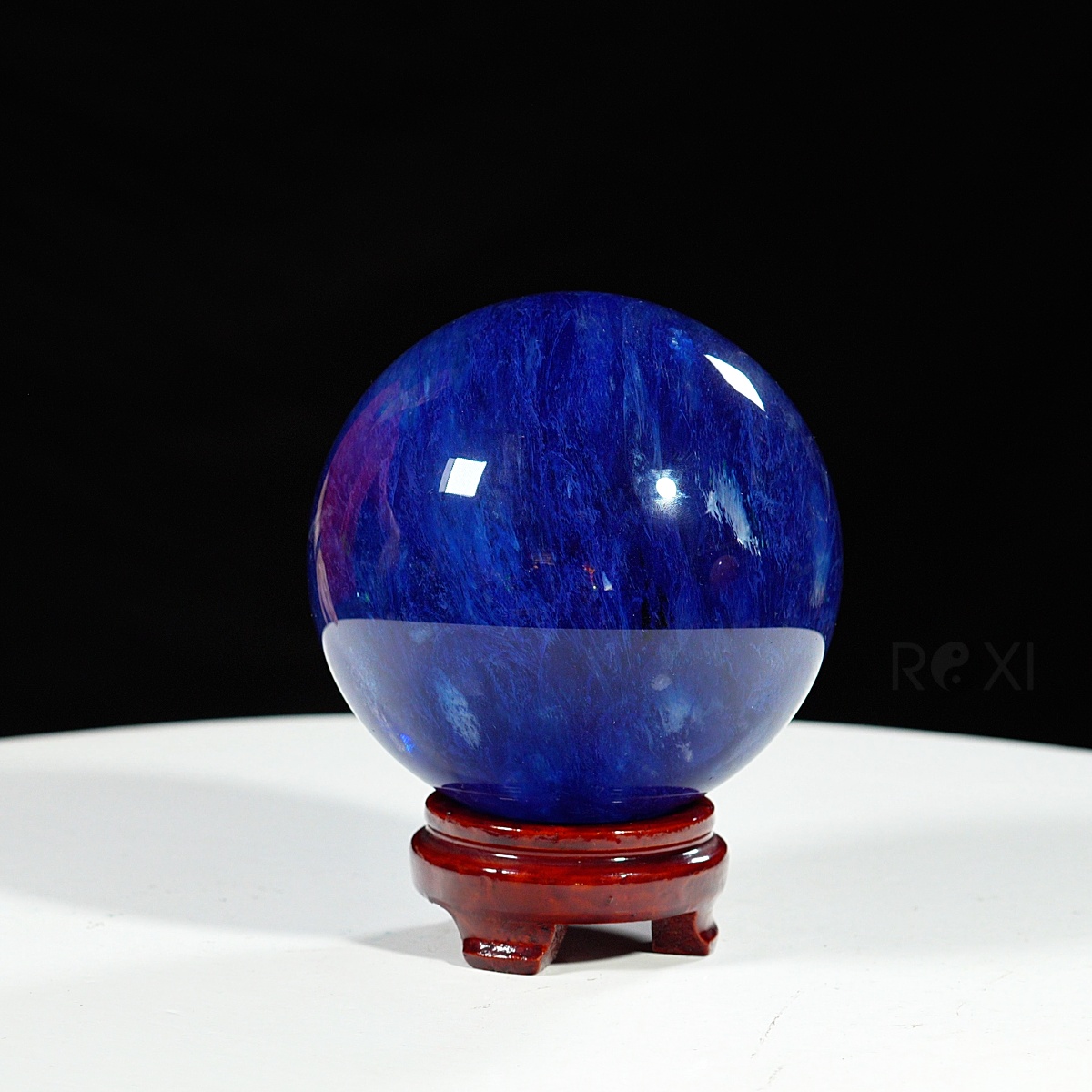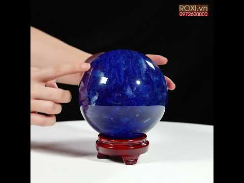Quả cầu đá màu xanh biển mang sắc xanh sâu thẳm như đại dương. Màu xanh của đá gợi cảm giác bình yên, trí tuệ và sự thông tuệ nội tâm. Bề mặt cầu được mài nhẵn bóng, năng lượng dương mạnh mẽ lan tỏa đều ra xung quanh – biểu tượng cho sự viên mãn, trọn vẹn và hanh thông trong mọi phương diện cuộc sống.