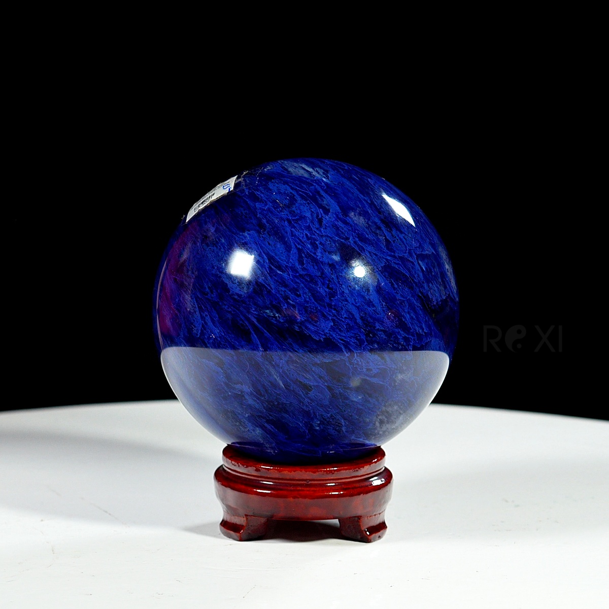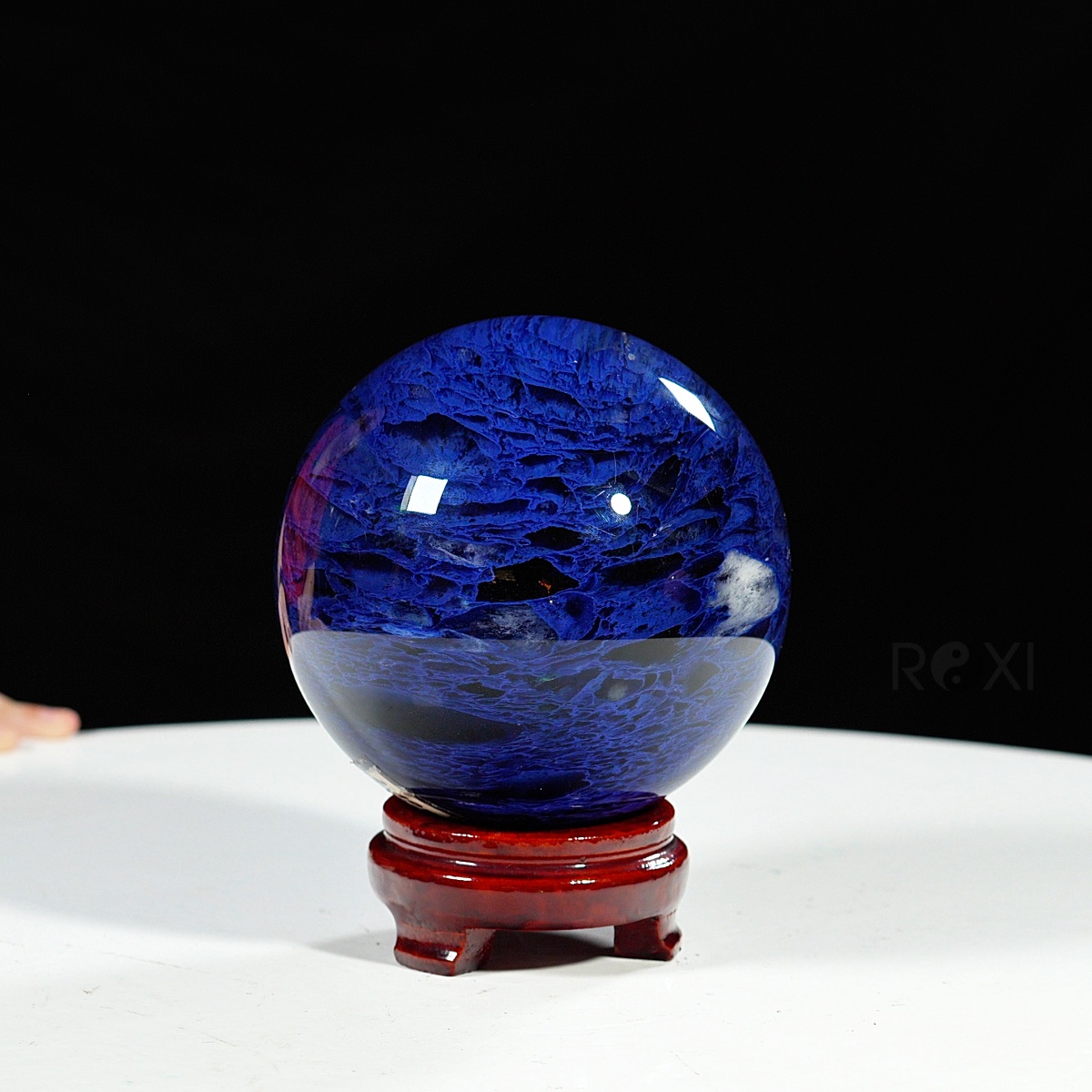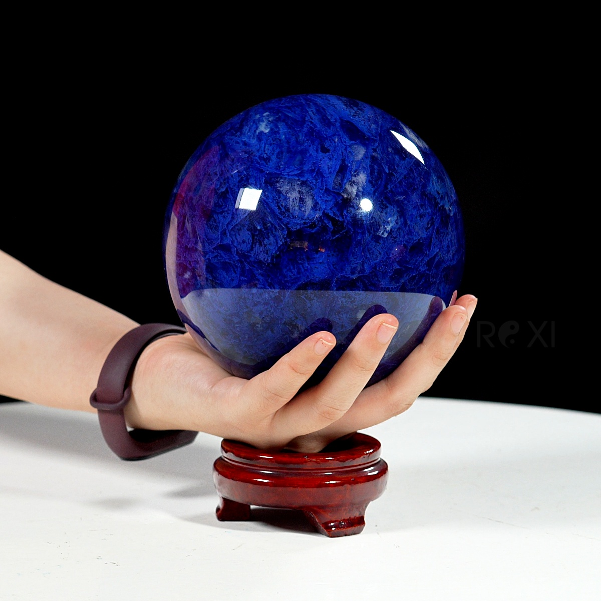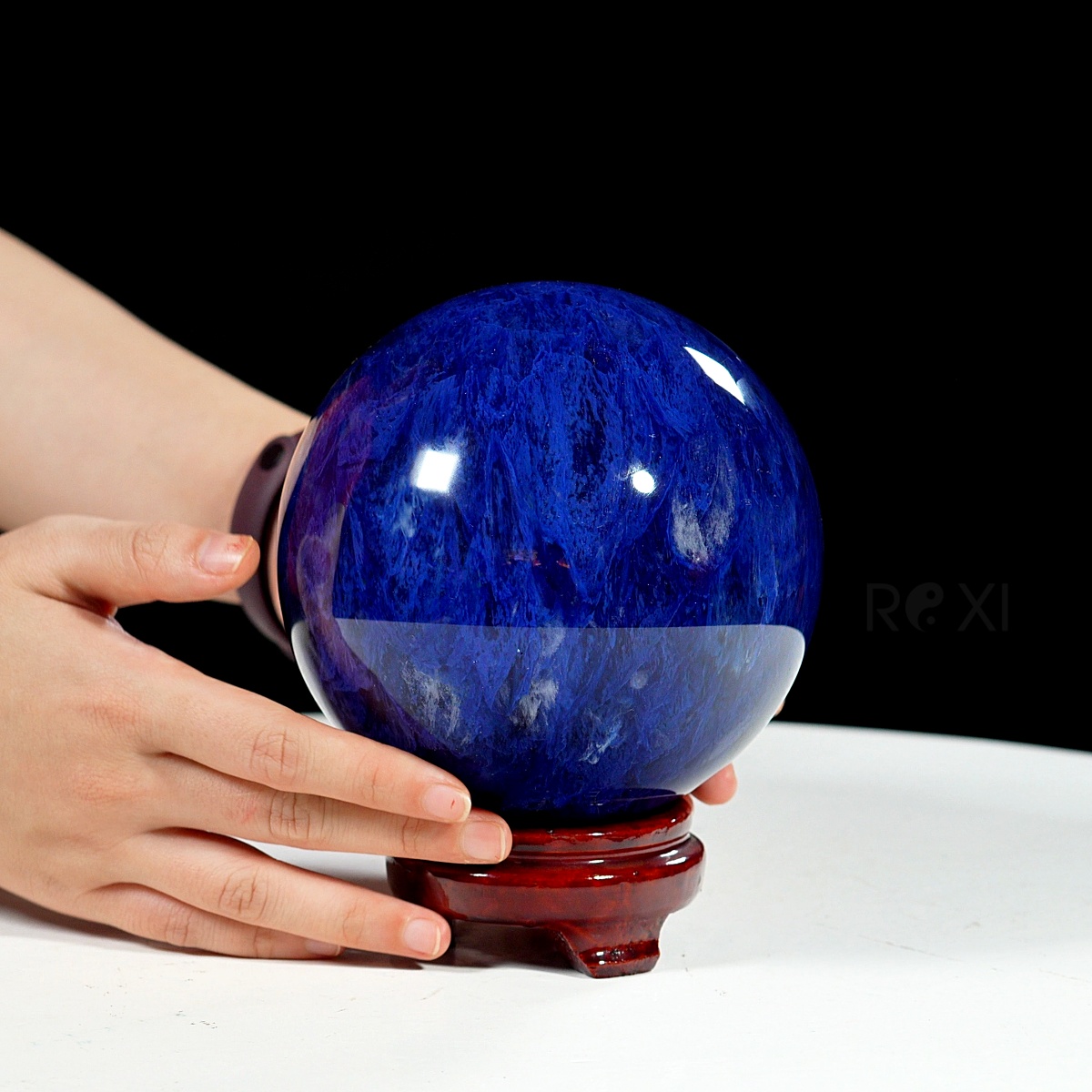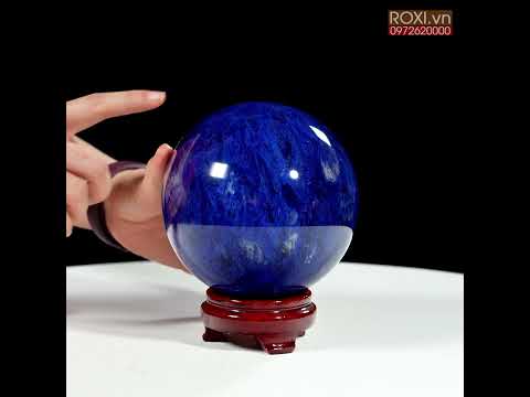 Quả cầu đá màu xanh biển mang sắc xanh sâu thẳm như đại dương. Màu xanh của đá gợi cảm giác bình yên, trí tuệ và sự thông tuệ nội tâm. Bề mặt cầu được mài nhẵn bóng, năng lượng dương mạnh mẽ lan tỏa đều ra xung quanh – biểu tượng cho sự viên mãn, trọn vẹn và hanh thông trong mọi phương diện cuộc sống.
