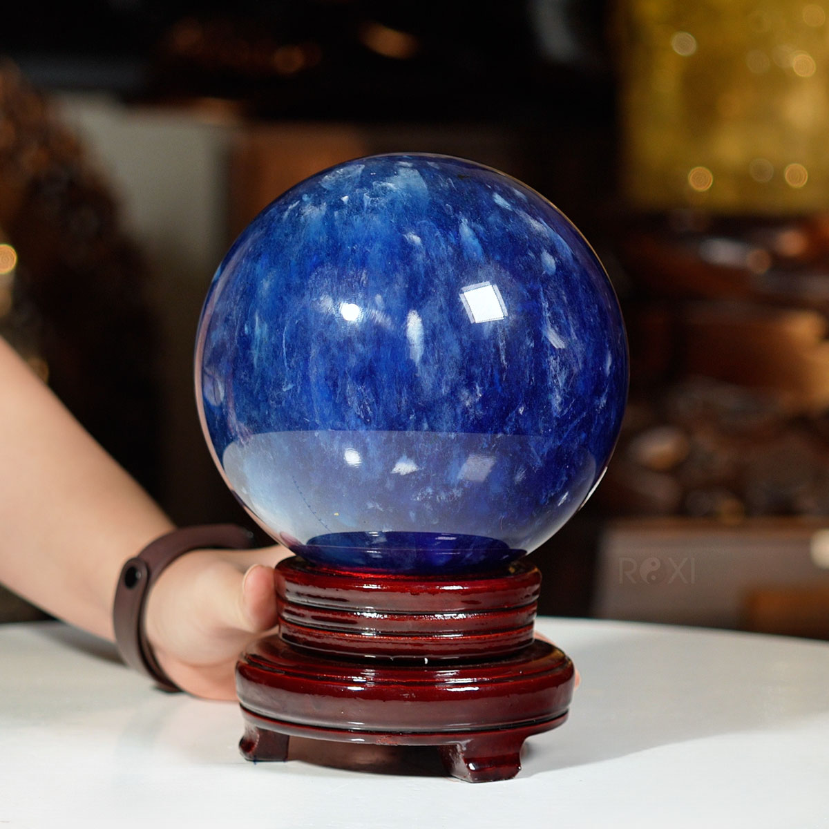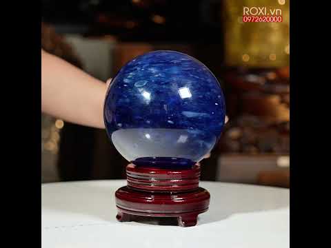 Quả cầu đá màu xanh biển mang sắc xanh sâu thẳm như đại dương. Màu xanh của đá gợi cảm giác bình yên, trí tuệ và sự thông tuệ nội tâm. Bề mặt cầu được mài nhẵn bóng, năng lượng dương mạnh mẽ lan tỏa đều ra xung quanh – biểu tượng cho sự viên mãn, trọn vẹn và hanh thông trong mọi phương diện cuộc sống.