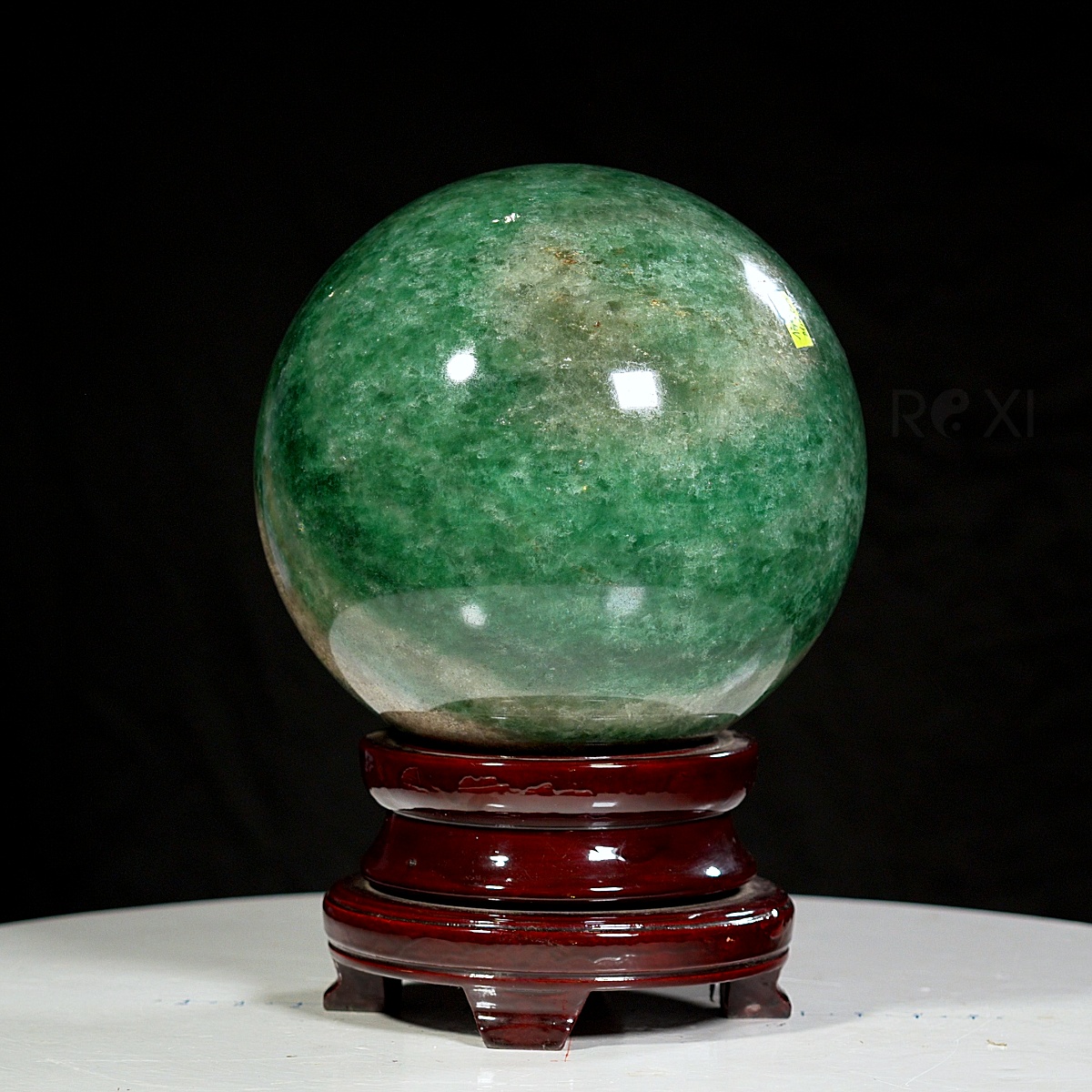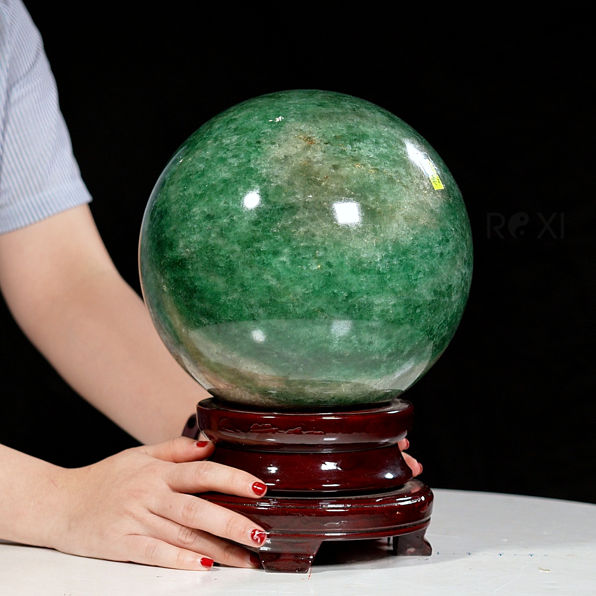 Quả cầu đá thạch anh xanh dâu tây tự nhiên nguyên khối, sản phẩm kèm đế và chứng thư kiểm định thạch anh tự nhiên.