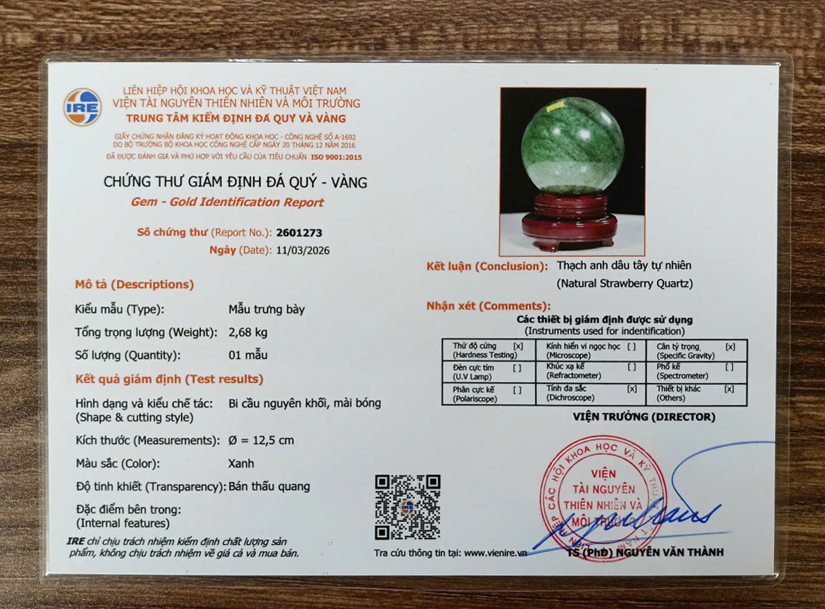 Quả cầu đá thạch anh xanh dâu tây tự nhiên nguyên khối, sản phẩm kèm đế và chứng thư kiểm định thạch anh tự nhiên.