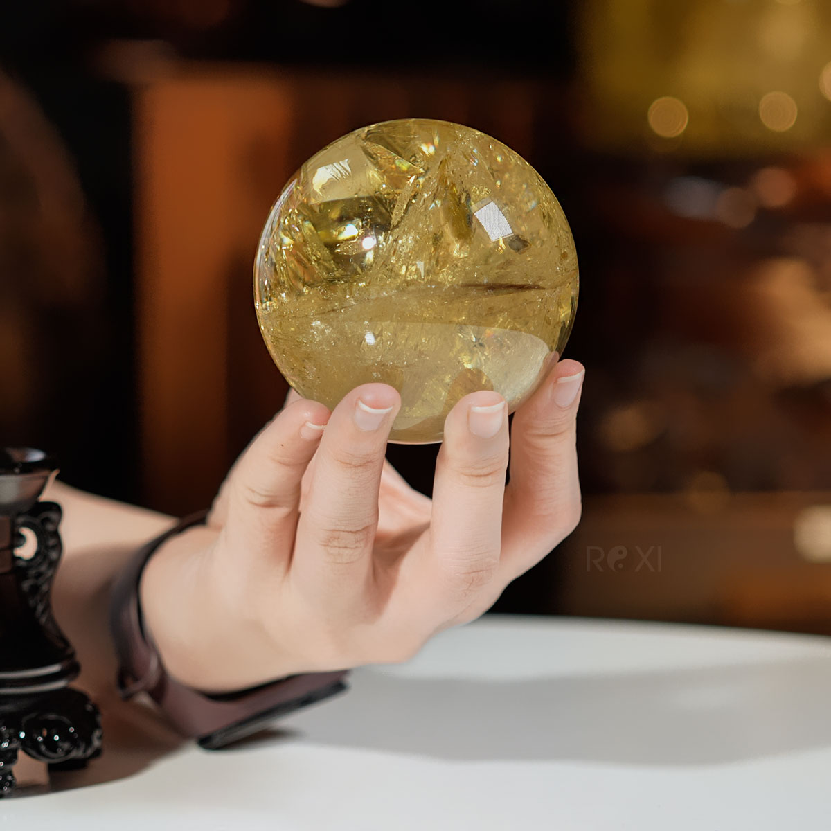 - Tính chất: Đá thạch anh vàng, hay còn gọi là Citrine Quartz, là loại đá quý tự nhiên, có độ cứng 7/10 trên thang Mohs. Đặc tính này giúp quả cầu có độ bền cao, chống trầy xước và giữ được vẻ đẹp bền bỉ theo thời gian.