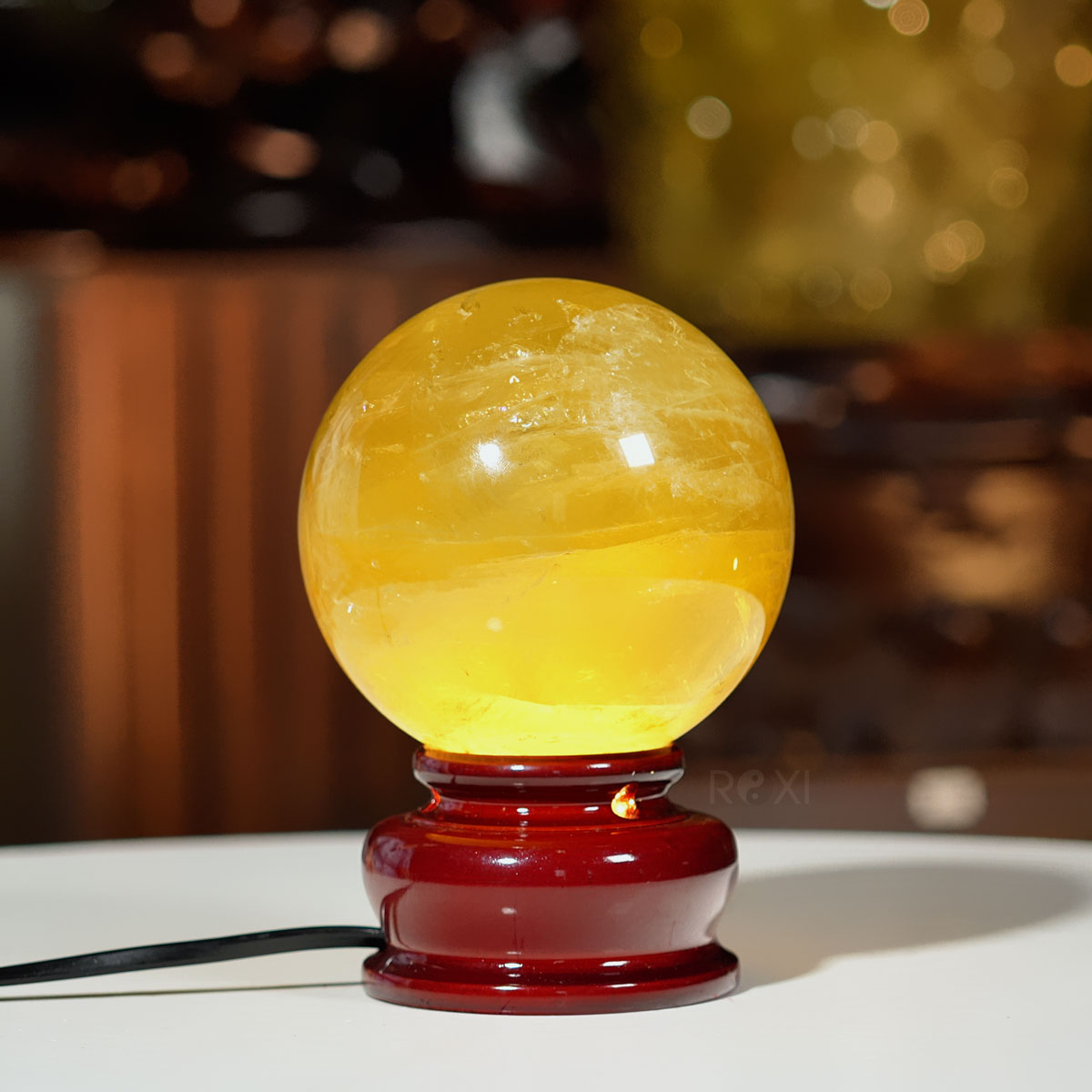 Quả cầu thạch anh vàng được chế tác từ đá thạch anh tự nhiên, mang sắc vàng rực rỡ tượng trưng cho tài lộc và thịnh vượng.