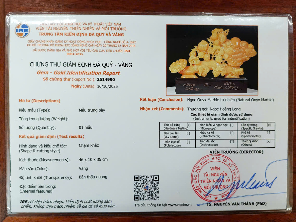 Gậy như ý là biểu tượng phong thủy quen thuộc, đại diện cho quyền lực, may mắn và sự hanh thông trong công việc cũng như cuộc sống. Tác phẩm được chế tác từ ngọc hoàng long tự nhiên, mang sắc vàng ấm áp, tượng trưng cho tài lộc, thịnh vượng và địa vị.