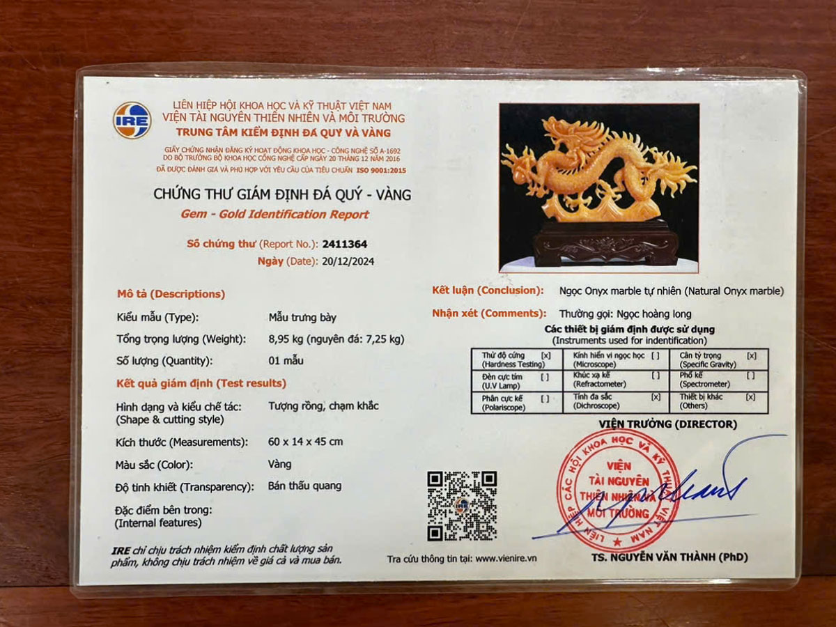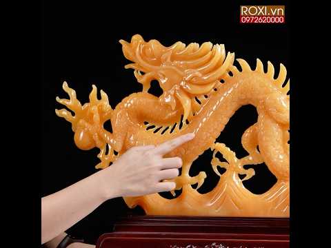 Tượng rồng được chế tác từ ngọc hoàng long tự nhiên, qua quá trình chạm khắc tỉ mỉ và sự tận tâm của người nghệ nhân: từng đường nét uốn lượn, từng vảy rồng được chạm khắc sắc nét, sống động, các chi tiết nhỏ như móng vuốt rồng, râu rồng cũng được chau chuốt tỉ mỉ tạo nên vẻ đẹp uy nghi và mạnh mẽ.