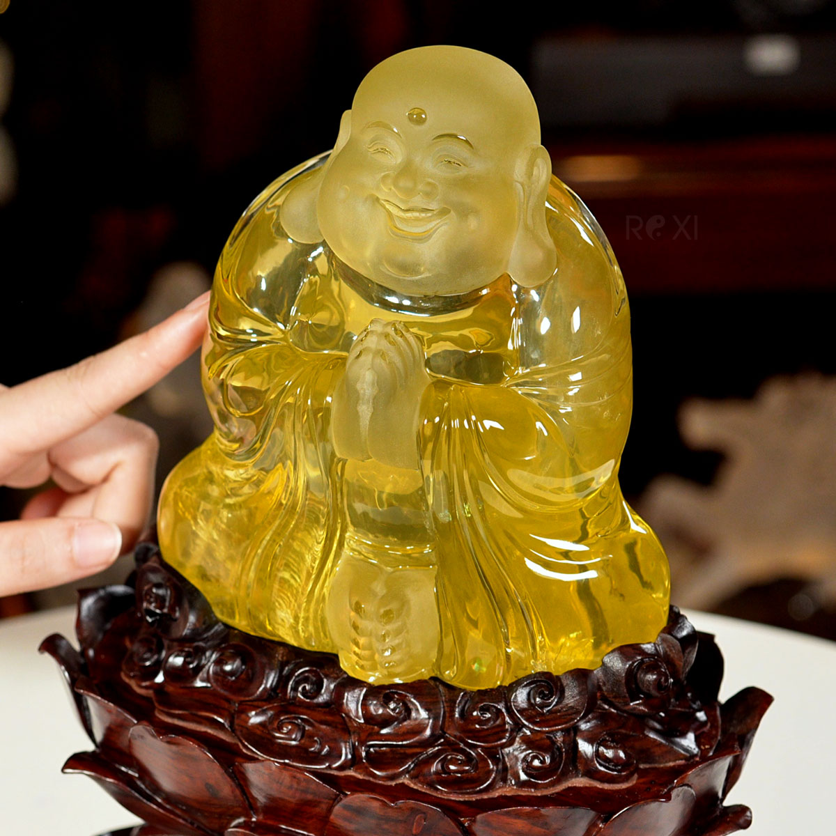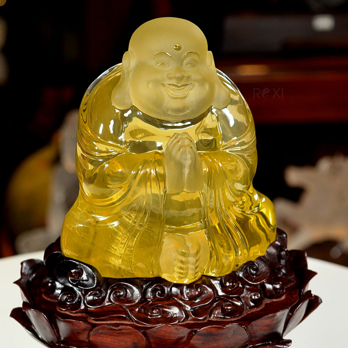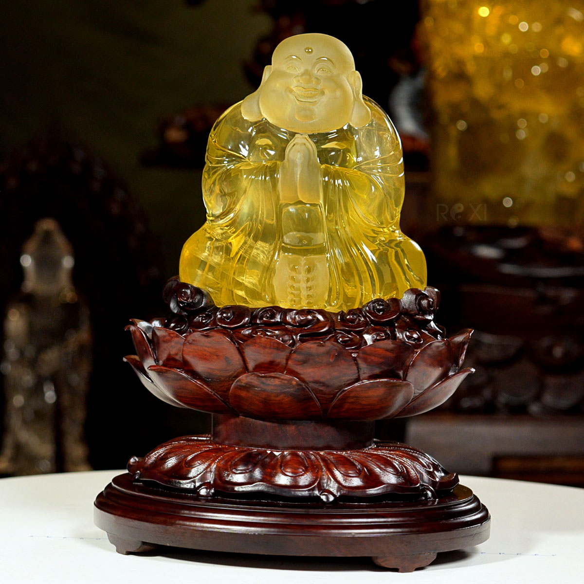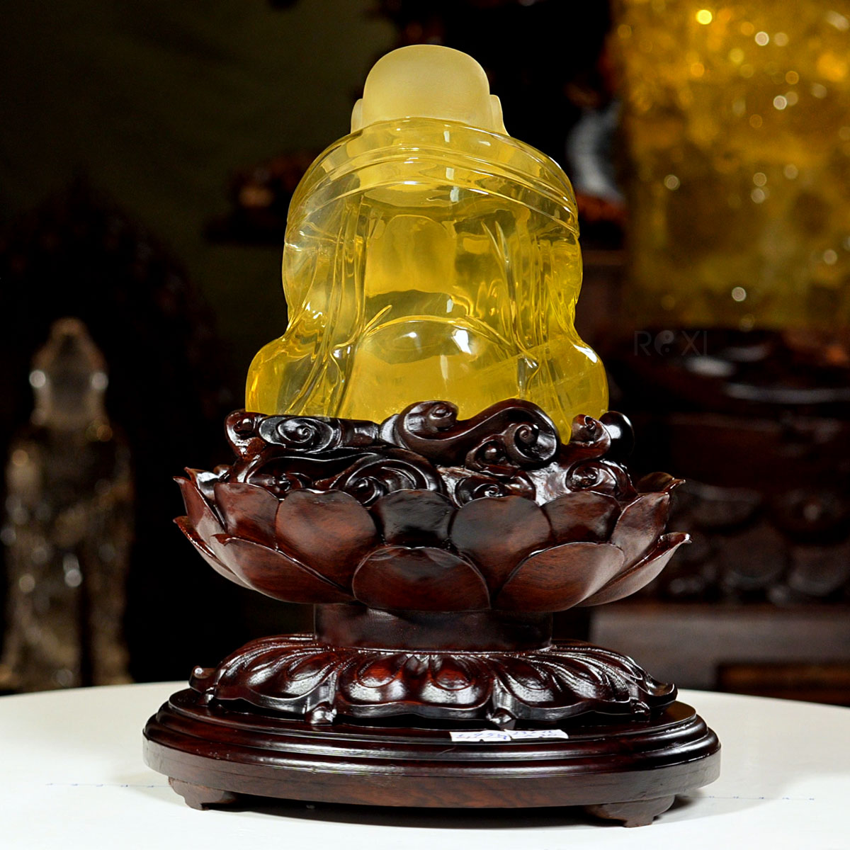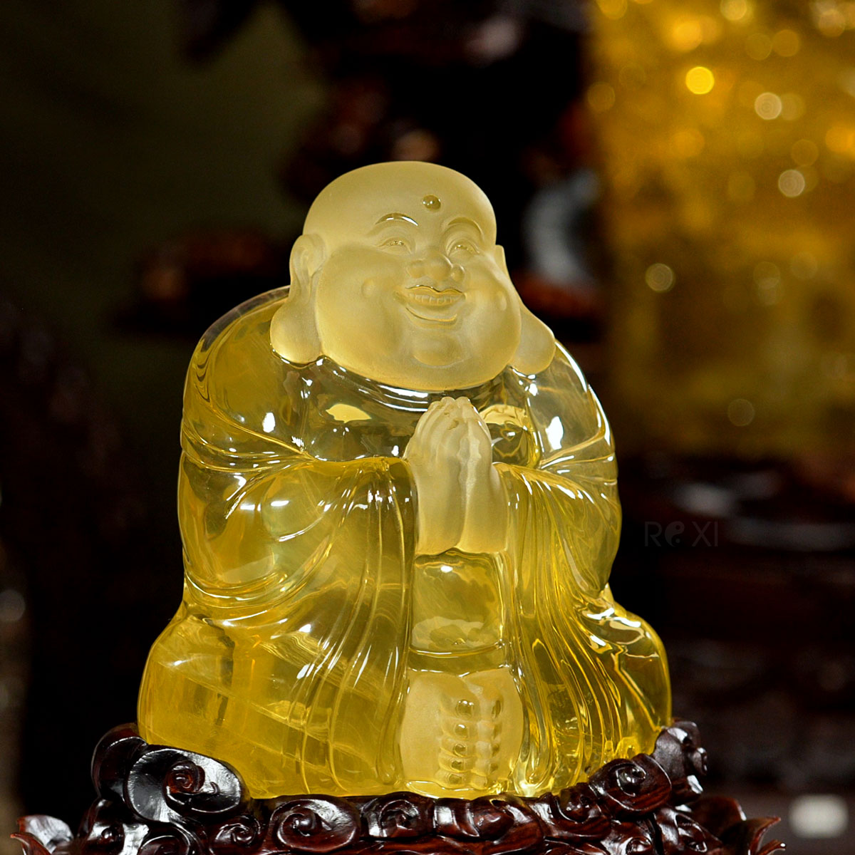 Tượng Phật Di Lặc đá thạch anh vàng tự nhiên nguyên khối. Tác phẩm có giá trị sưu tầm cao, quý hiếm và độc bản, đây cũng tác phẩm được chọn làm quà tặng phong thủy cao cấp.