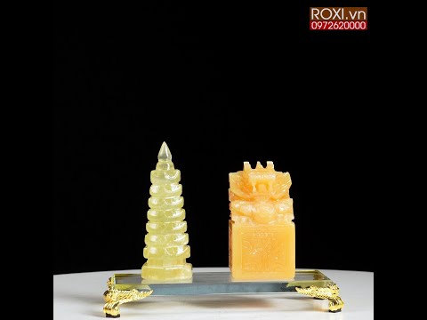Bộ vật phẩm phong thủy Tháp văn xương thạch anh vàng và ấn rồng ngọc hoàng long là những vật phẩm phong thủy bày trí bàn làm việc giúp thăng tiến công việc, hỗ trợ bản mệnh thêm thịnh vượng, củng cố quyền uy và địa vị.