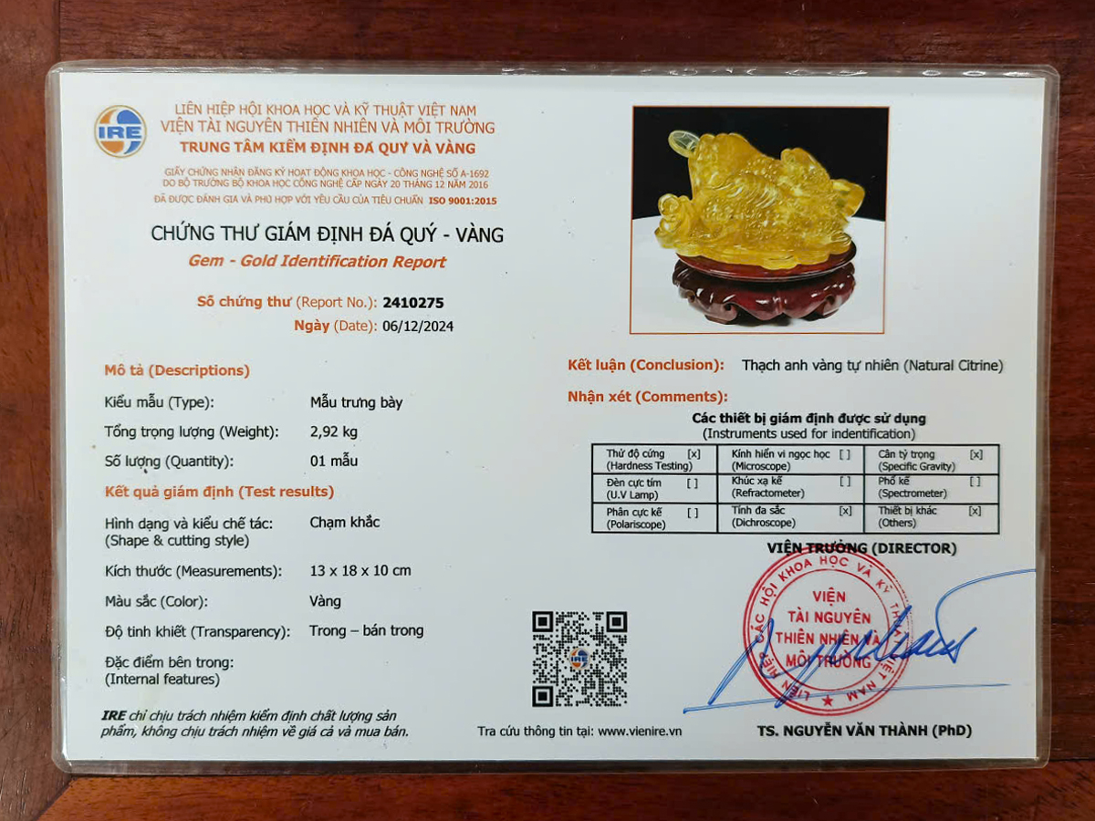 Tác phẩm kèm chứng thư kiểm định thạch anh tự nhiên.
