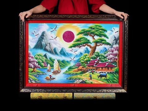 Trong bức tranh đá quý Thuận Buồm Xuôi Gió, có thể dễ dàng nhận thấy một cảnh thiên nhiên tuyệt đẹp với mặt trời mọc rực rỡ phía xa, chiếu sáng cả bầu trời và mặt nước. Hình ảnh con thuyền buồm căng gió, lướt nhẹ trên mặt nước trong vắt, tượng trưng cho sự thuận lợi, may mắn và thành công. Những cánh buồm đỏ rực nổi bật giữa cảnh sắc thiên nhiên, tạo nên điểm nhấn mạnh mẽ và ấn tượng.