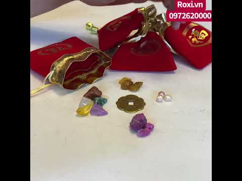 Túi đỏ tài lộc gồm 3 viên ngọc trai tự nhiên + 5 viên đá thạch anh 5 màu + 1 đồng hoa mai kim + đá quý ruby + hổ phách tự nhiên tiền với ý nghĩa chiêu tài, hút lộc, trừ tà, mang lại may mắn, thuận lợi cho gia chủ.