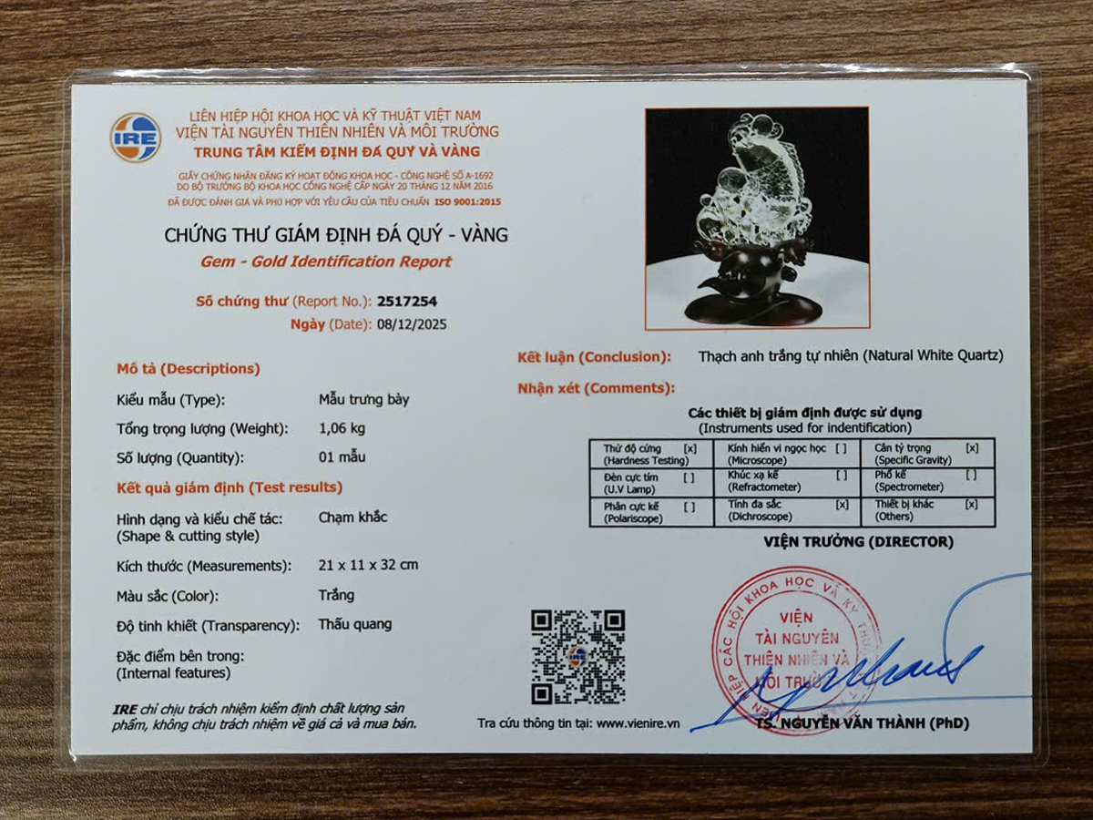 Điểm đặc biệt của tác phẩm này chính là chất liệu thạch anh trắng tự nhiên VIP, phôi trong suốt, hiếm gặp. Thạch anh trắng vốn được coi là “viên đá của trí tuệ và sự tinh khiết”, giúp cân bằng năng lượng, mang lại sự bình an, sáng suốt và thu hút may mắn.