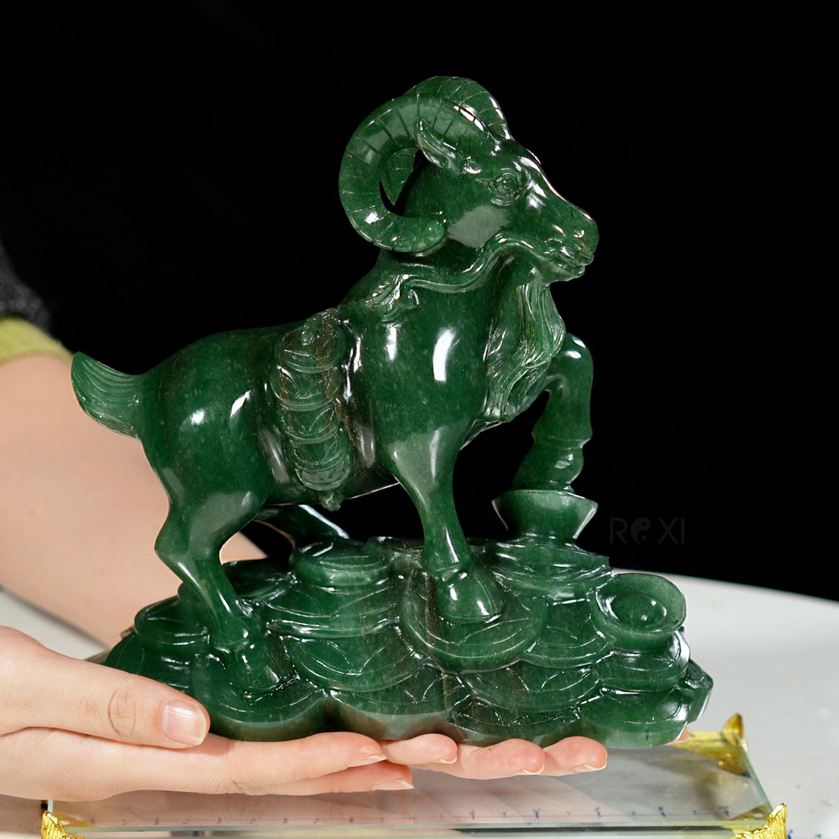 Tượng dê bằng đá thạch anh xanh tự nhiên nguyên khối.