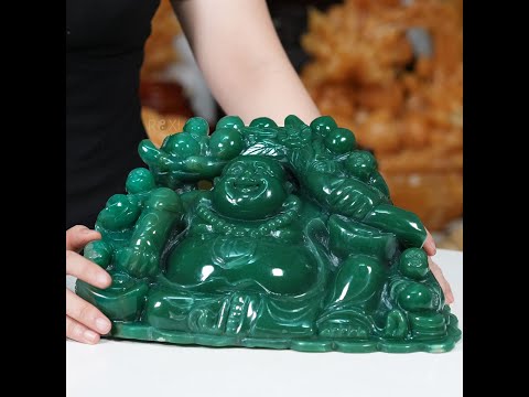 Tượng Phật di lặc ngũ phúc đá thạch anh xanh được khắc họa với hình ảnh mập mạp, áo mặc hở bụng, đi chân trần, nụ cười hoan hỉ thể hiện cho tấm lòng bao dung độ lượng, Tay bên phải Ngài vác cành đào tiên, tay bên trái cầm gậy như ý, xung quanh là 5 đứa trẻ đang chơi đùa, 5 đứa trẻ này tượng trưng cho 5 điều cơ bản mà con người hướng tới trong cuộc sống: Phúc, Lộc, Thọ, Khang, Ninh (Hạnh phúc, tài lộc, trường thọ, sức khỏe, an vui)