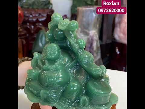 Tượng phật di lặc được chế tác từ đá thạch anh xanh tự nhiên nguyên khối, các đường nét chạm khắc tinh xảo và mềm mại, tạo nên hình tượng ngài di lặc đầy hoan hỷ, an vui.
