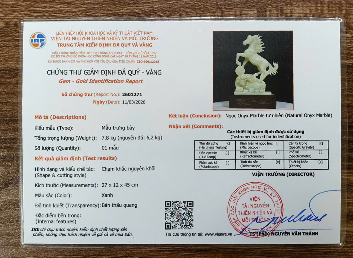 Tượng ngựa đá phong thủy được chế tác từ ngọc tự nhiên nguyên khối, tác phẩm kèm chứng thư kiểm định và hộp đẹp.