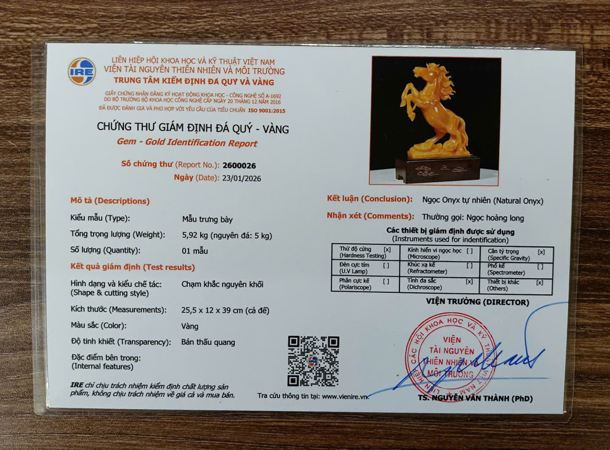 Tượng ngựa đá phong thủy được chế tác từ ngọc tự nhiên nguyên khối, tác phẩm kèm chứng thư kiểm định và hộp đẹp.