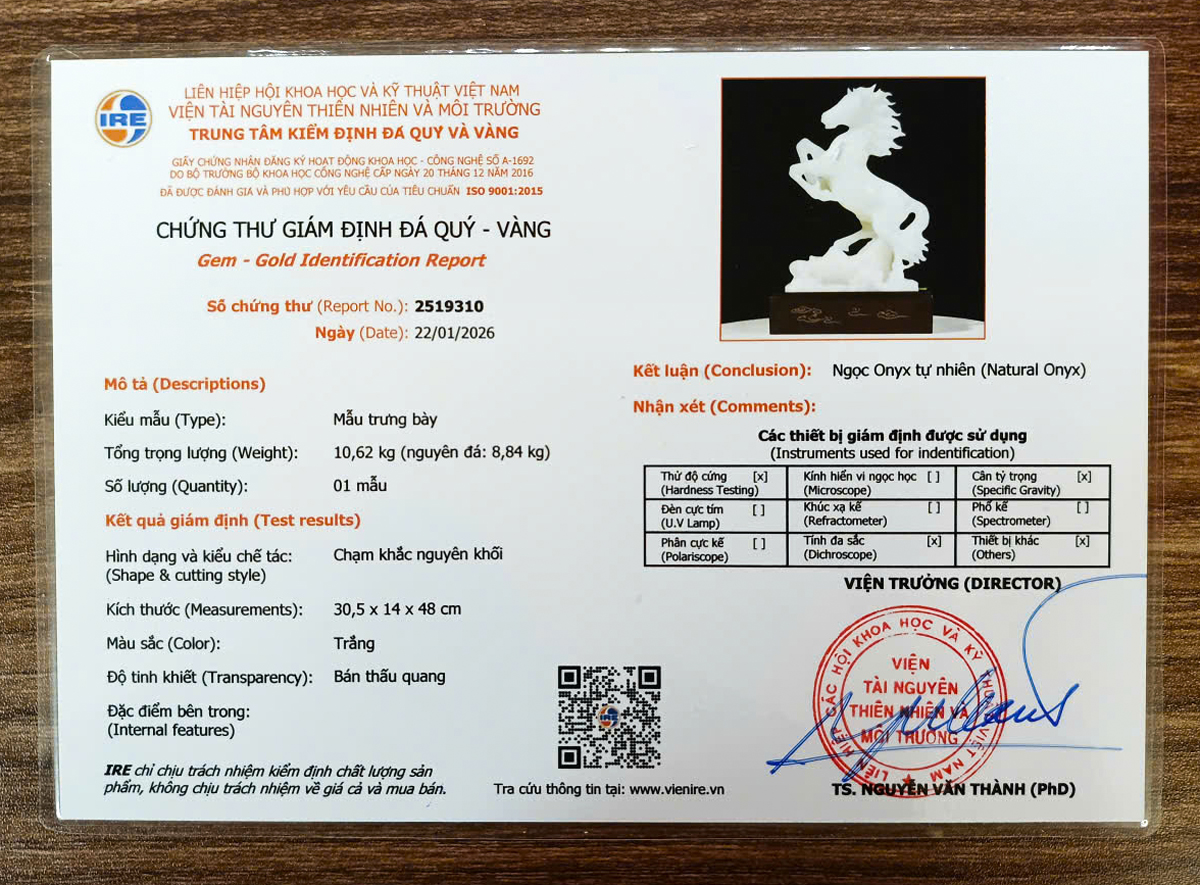 Tượng ngựa đá phong thủy được chế tác từ ngọc tự nhiên nguyên khối, tác phẩm kèm chứng thư kiểm định và hộp đẹp.