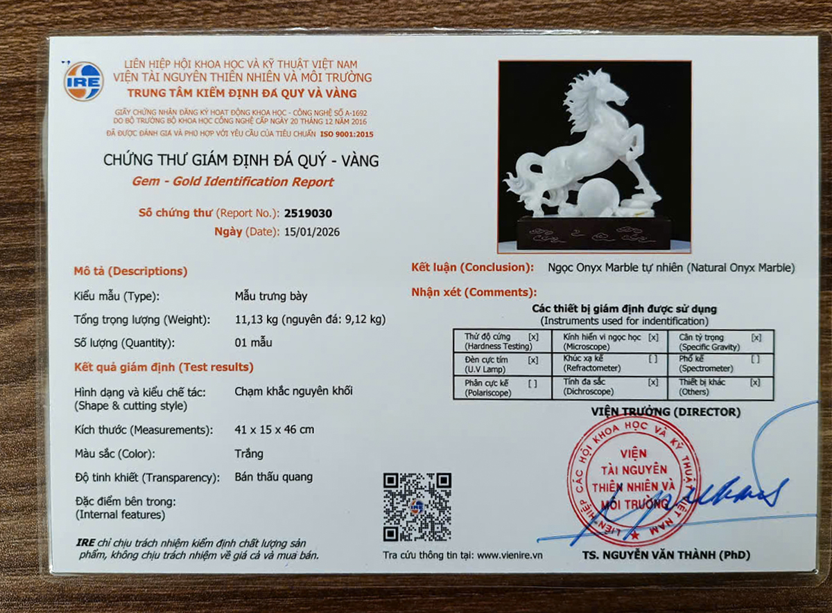 Tượng ngựa đá phong thủy được chế tác từ ngọc tự nhiên nguyên khối, tác phẩm kèm chứng thư kiểm định và hộp đẹp.