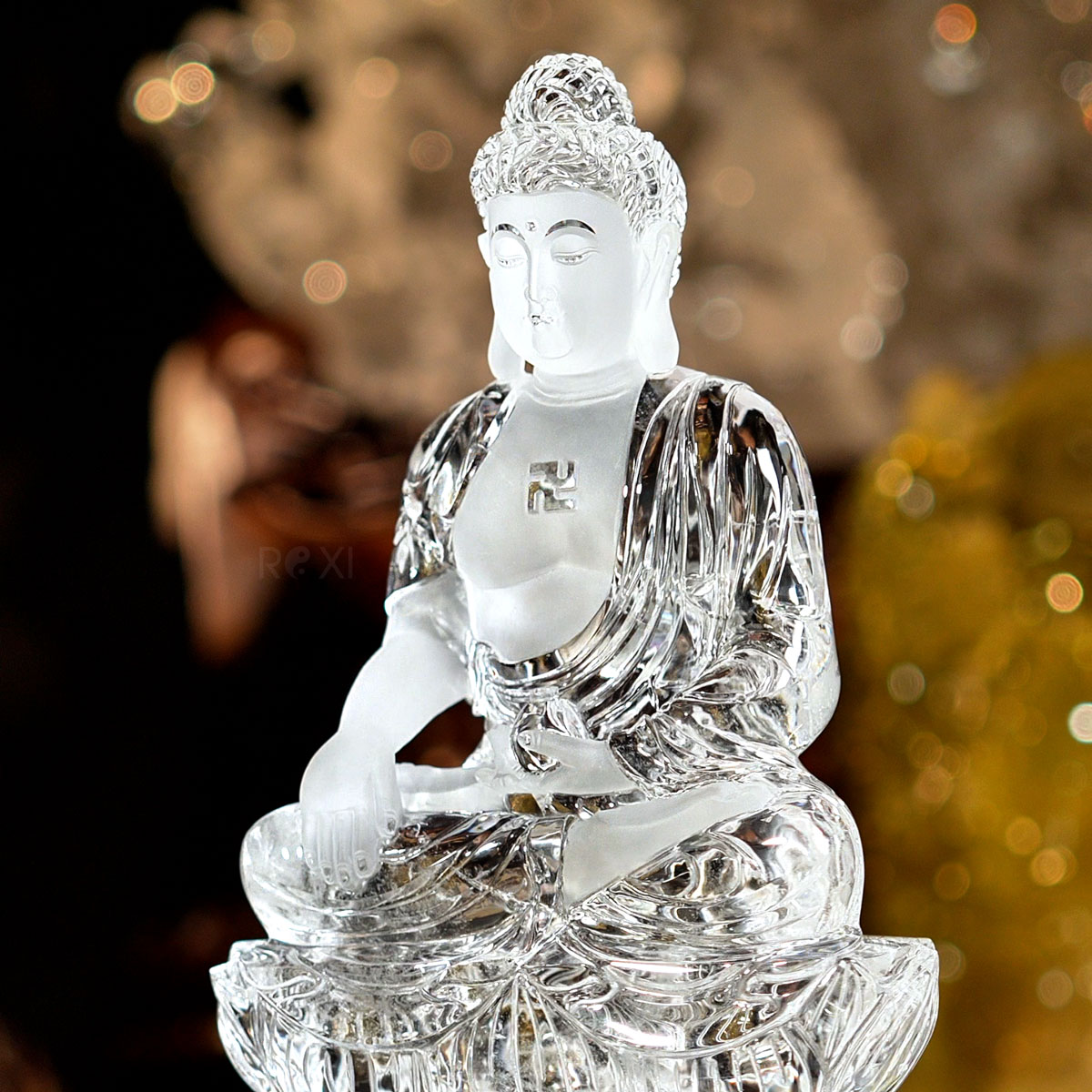 Tác phẩm Tượng Phật A di đà thạch anh khắc họa chi tiết và tỉ mỉ hình ảnh, thần thái của Ngài: Ngài ngồi kiết già trên đài sen, Khuôn mặt Ngài an nhiên, hiền từ, đôi mắt khép nhẹ trong trạng thái tĩnh lặng tuyệt đối. Ở giữa ngực khắc chữ Vạn biểu trưng cho sự giác ngộ vẹn toàn và công đức vô lượng.