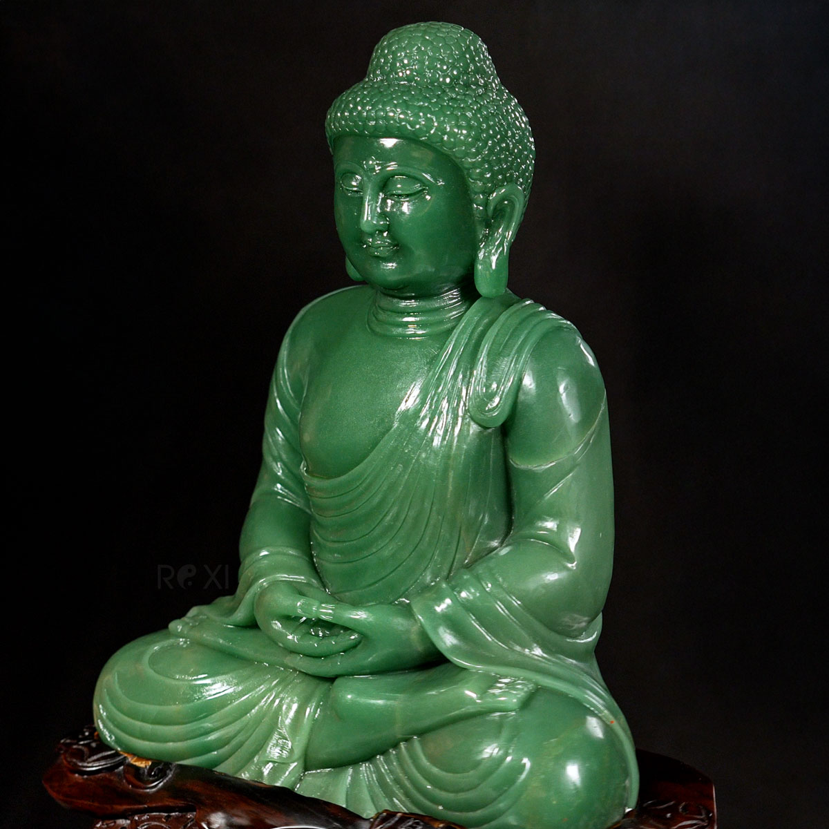 Tượng Phật được khắc họa với hình ảnh ngài ngồi trên đài sen trong tư thế thiền định, tay kết ấn thiền, và điều đặc biệt là ngay khi nhìn vào bức tượng ta cảm nhận được thần thái an nhiên, từ bi của ngài : ánh mắt khép hờ, khuôn mặt hiền từ, môi ngài như đang mỉm cười. Từng nếp áo được nghệ nhân khắc chạm khéo léo, mềm mại, rủ xuống tự nhiên mà vẫn toát lên vẻ uy nghi và tôn kính.