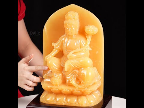 Tượng Phổ hiền bồ tát ngọc hoàng long được chế tác từ ngọc hoàng long tự nhiên nguyên khối, được chạm khắc thủ công, tinh xảo và sắc nét. Khối ngọc màu vàng được hình thành từ hàng trăm triệu năm trong lòng đất, mang tinh hoa linh khí của đất trời, có độ bền cao, trường tồn và vĩnh cửu với thời gian.