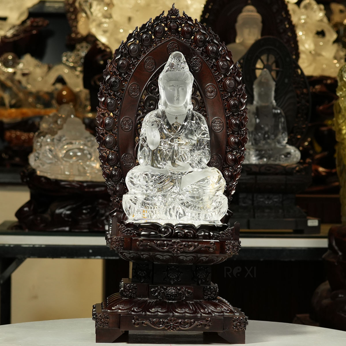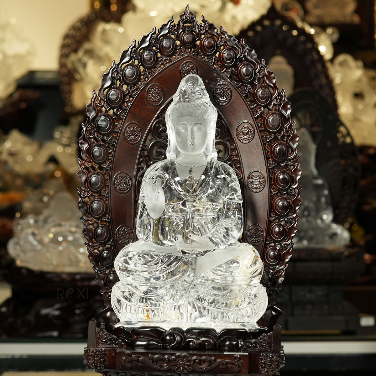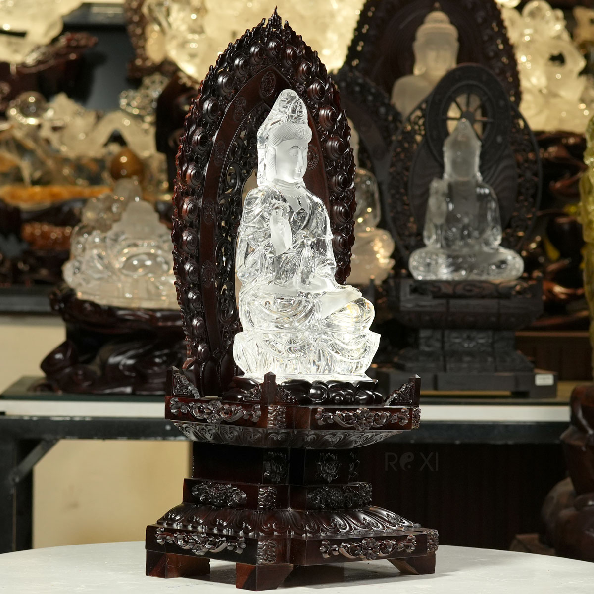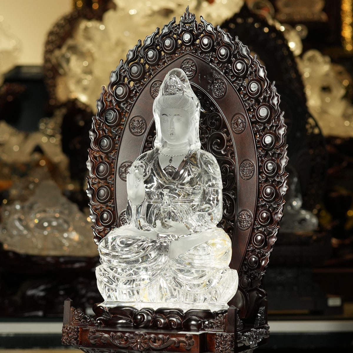 Tượng Quan Âm bồ tát bằng đá thạch anh là tượng tạc, điêu khắc hình tượng Quan Âm Bồ Tát từ những khối đá thạch anh trắng tự nhiên nguyên khối, đây là loại đá quý hiếm với độ tinh khiết cao, mang vẻ đẹp thuần khiết, là biểu tượng của sự thanh tịnh và bình yên.
